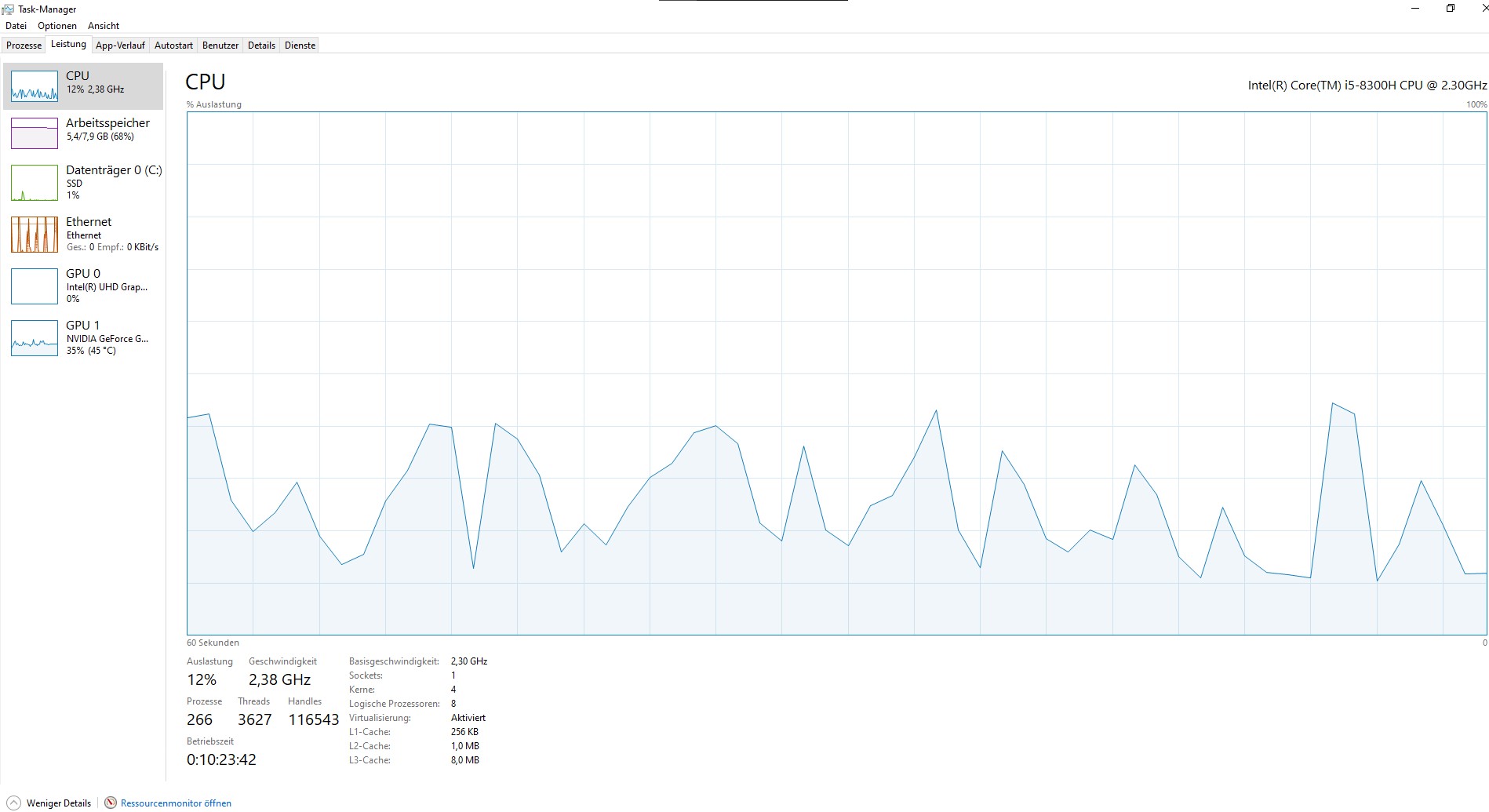 Hier ist die Leistung beim Taskmanager und nein mein Laptop hat nicht gehangen während dem Screenshot. Aber der hat halt kurz pausiert fals du das meinst weil ichs mit Windows Shift und S gemacht habe