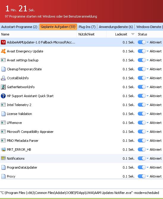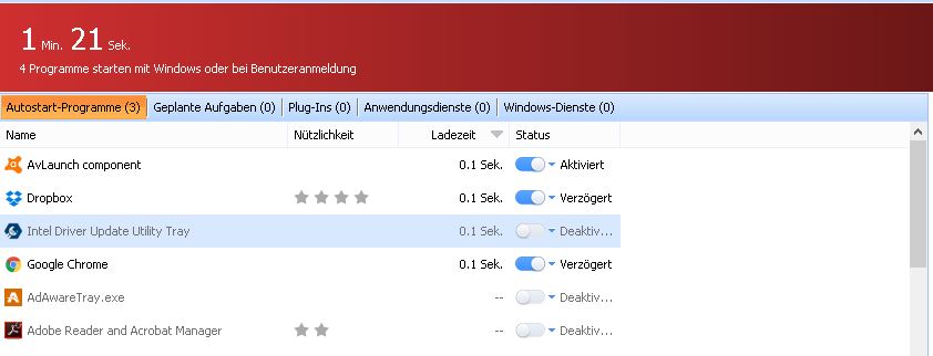 Bis der Rechner komplett hochgefahren ist, dauert es schon gute 5 Minuten (früher auch länger). Interessanterweise habe ich CCleaner und Glary Utilities drüber laufen lassen, sämtliche Aufgaben, Autostartprogramme deaktiviert - dann hatte der Laptop nur noch knapp eine Minute gebraucht, bis er komplett fertig hochgefahren ist. Allerdings hat das nicht lange gehalten - obwohl kaum und wenig damit gearbeitet wurde. Bis Programme gestartet werden, dauert es auch lange. Wenn es geladen ist, kann ich gut damit arbeiten - aber bis es soweit ist ...