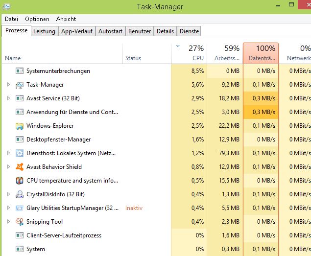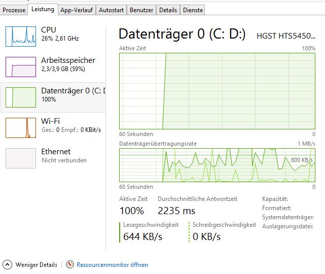 Ich hoffe die wichtigsten Daten sind da. Über den Taskmanager habe ich gesehen, dass die Festplatte fast immer bei 100 % läuft (es sei denn ich mach wirklich gar nichts). Arbeitsspeicher ist meist so um die 30-50 % und Prozessor geht selten mal über 30 % Auslastung raus.