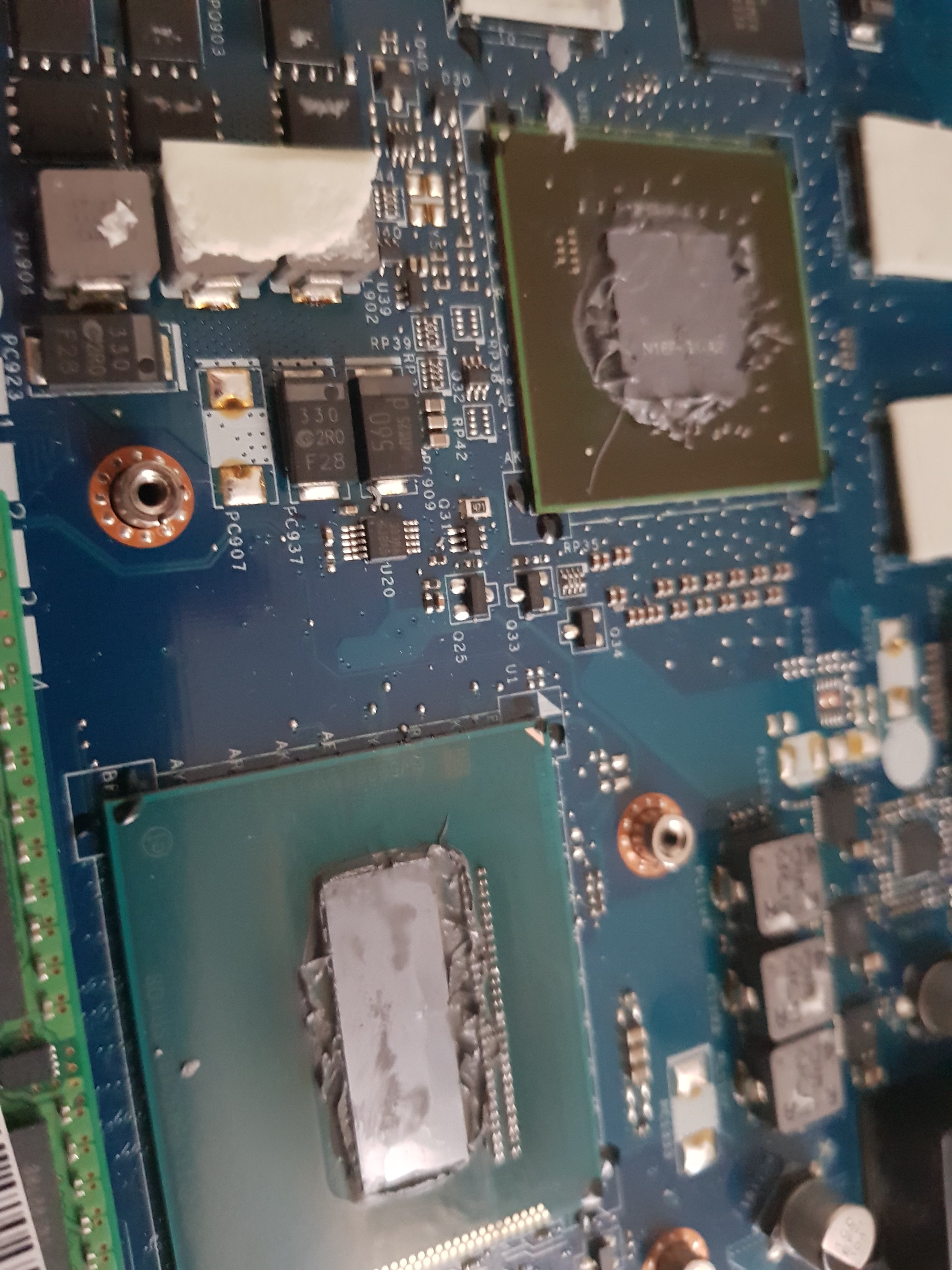 Was sind denn das für schwarze Flecken (hynix) oder die braune Patina an der Lötstelle 1215? Korrosion oder Flussmittel? Wahrscheinlich sollte man mal das MB per Isopropanol säubern.