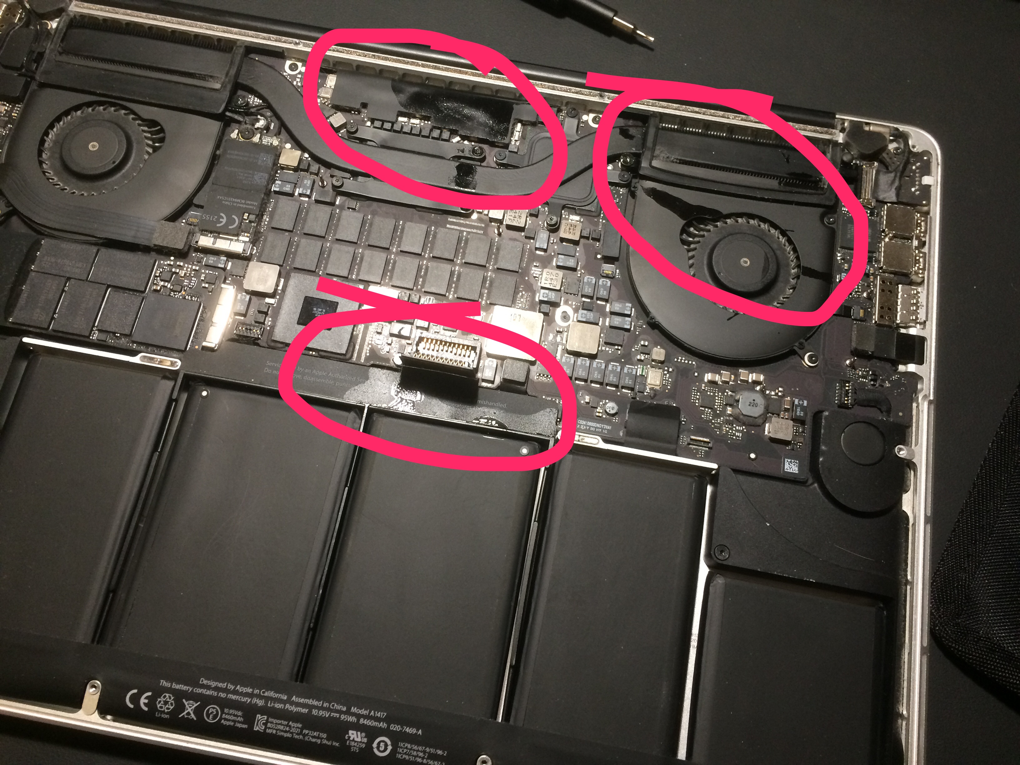 wie oben zu lesen ist, hat mein 2012er Retina Macbook Pro einen kleinen Schwall Flüssigkeit durch einen seitlichen Lüftungsschlitz abbekommen (ironischerweise Apfelsaft - vlt. Karma, weil Windows drauf läuft^^).