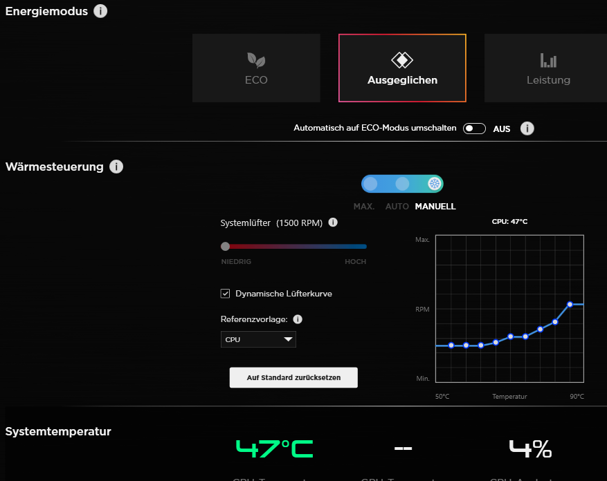 Im BIOS fand ich folgende Option, die ich auch schon mehrfach an und wieder ausgeschaltet habe, jedoch schien dies keine Auswirkungen zu haben. Ich bin etwas am verzweifeln, da die Kiste doch effizienter und kühler als der Transcend 14 ist, jedoch ständig diese bekloppte Lüftung läuft, was im leisen Büro bzw. Hörsaal echt ein bisschen ärgert.
