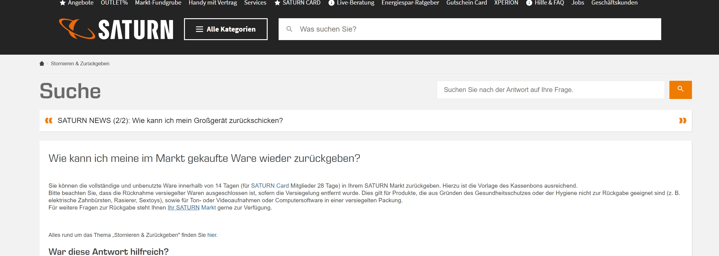 Hat jemand Erfahrungen mit einer Rückgabe bei Saturn in einem ähnlichen Fall?