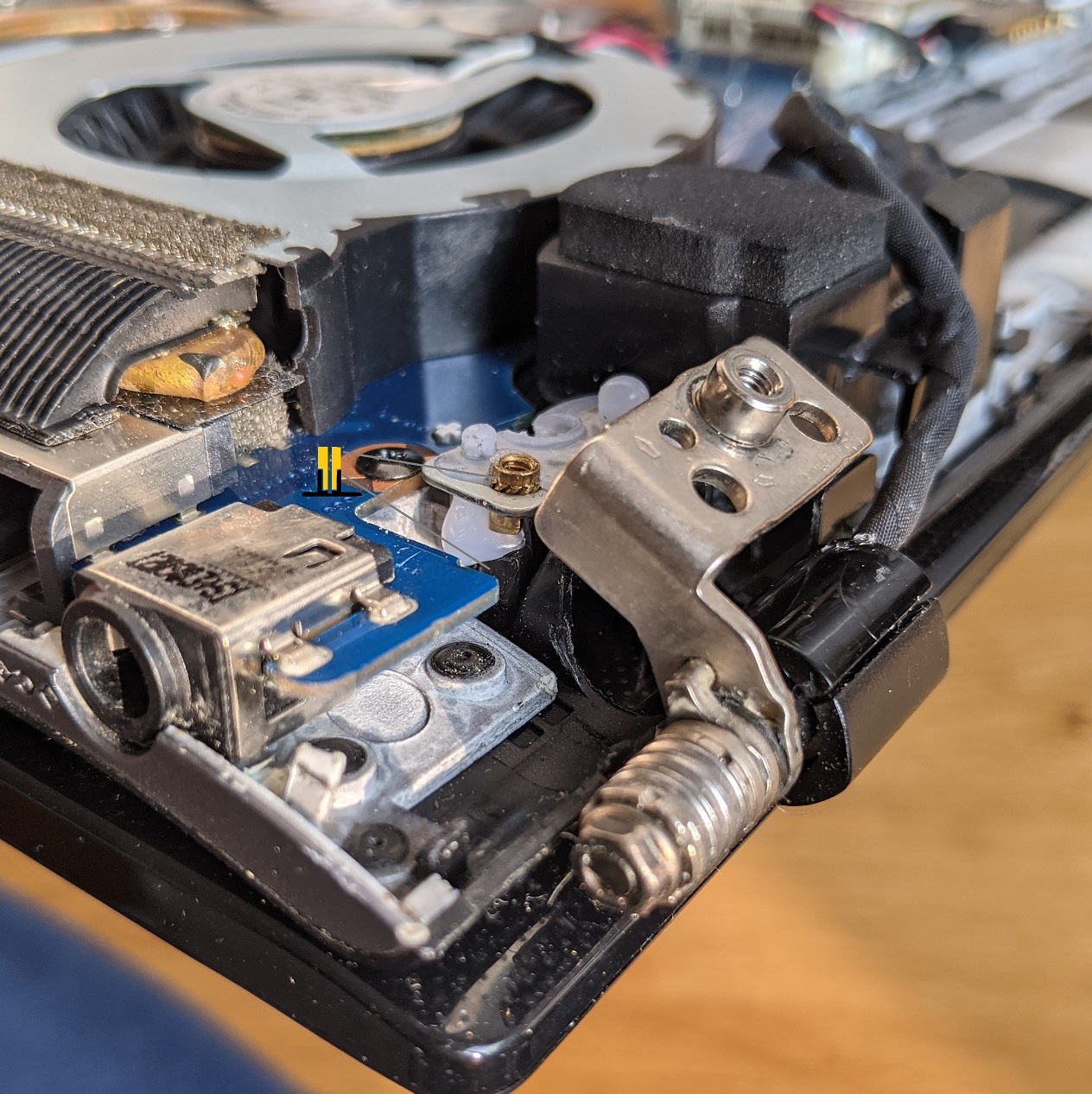 - Man sieht meine temporäre Reparatur mit Heißkleber. Der Heißkleber füllt momentan den Raum aus, der durch das weggebrochene Plastikteil entstanden ist. Ich musste außerdem die Spannkraft des Scharniers lockern, weil ein Teil des Scharniers an der blauen Platine gehebelt hat. Dafür kann ich den Laptop jetzt nur mit gegen die Wand gelehntem Bildschirm nutzen.