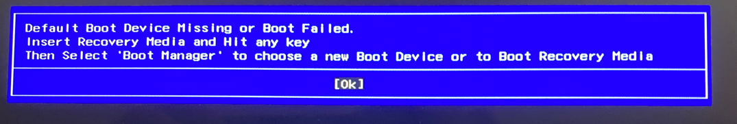 Default Boot Device Missing or Boot Failed. Insert Recovery Media and Hit any key Then Select 'Boot Manager to choose a new Boot Device or to Boot Recovery Media