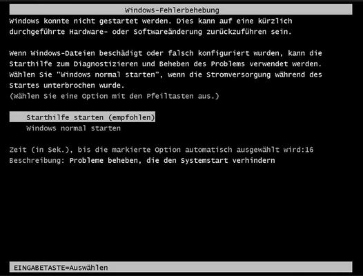 Dann habe ich wieder eingeschalten und es kam "Windows normal starten" und "Starthilfe (empfohlen)". Aber egal auf was ich drücke, ich lande immer wieder bei diesem Feld.