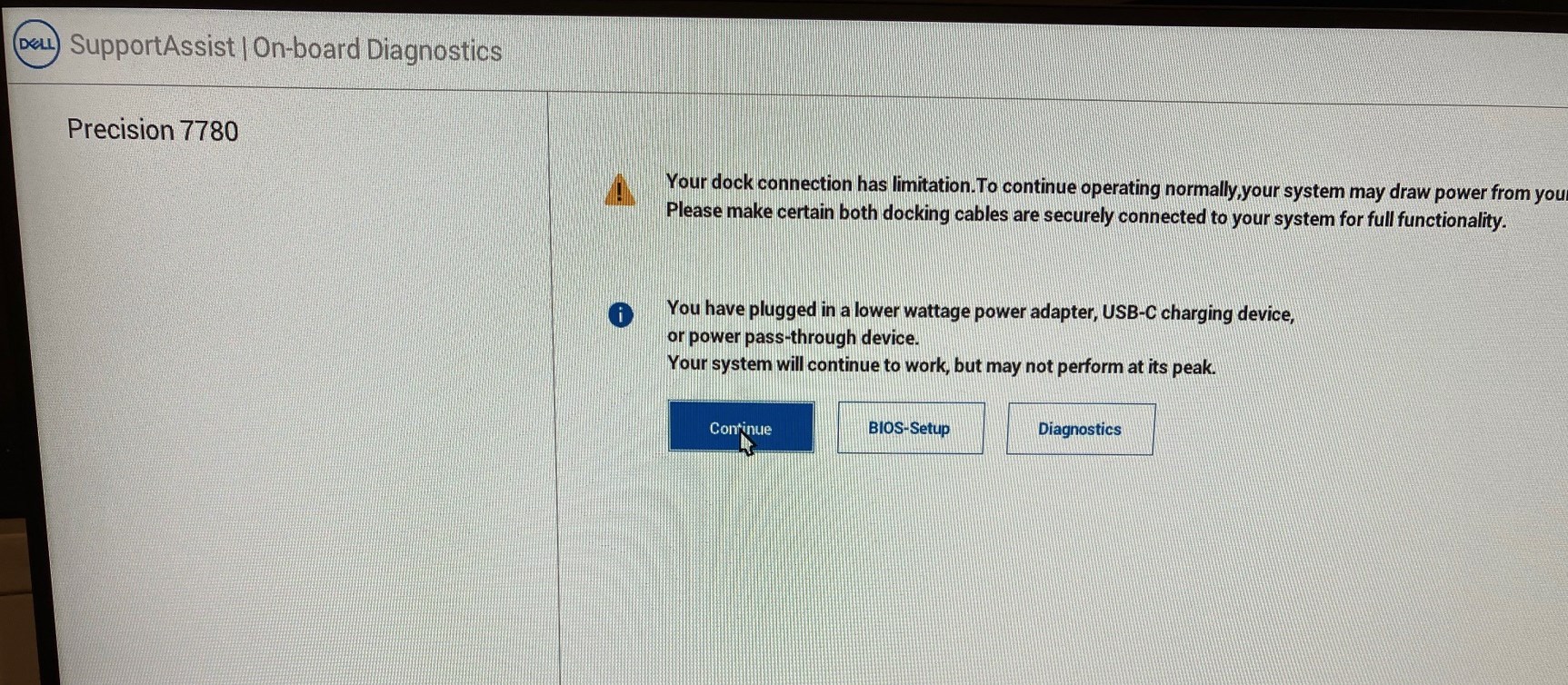 Die Fehlermeldungen vom Bios auf erstem und drittem Bild sind auf alle Fälle "zu wenig Strom vom Dock", was logisch ist. Das WD22TB liefert 130W, der Laptop braucht mehr.