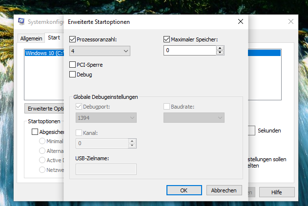 Nimm mal die zwei Haken bei Prozessoranzahl und Maximaler Speicher raus und starte den Laptop mal neu.