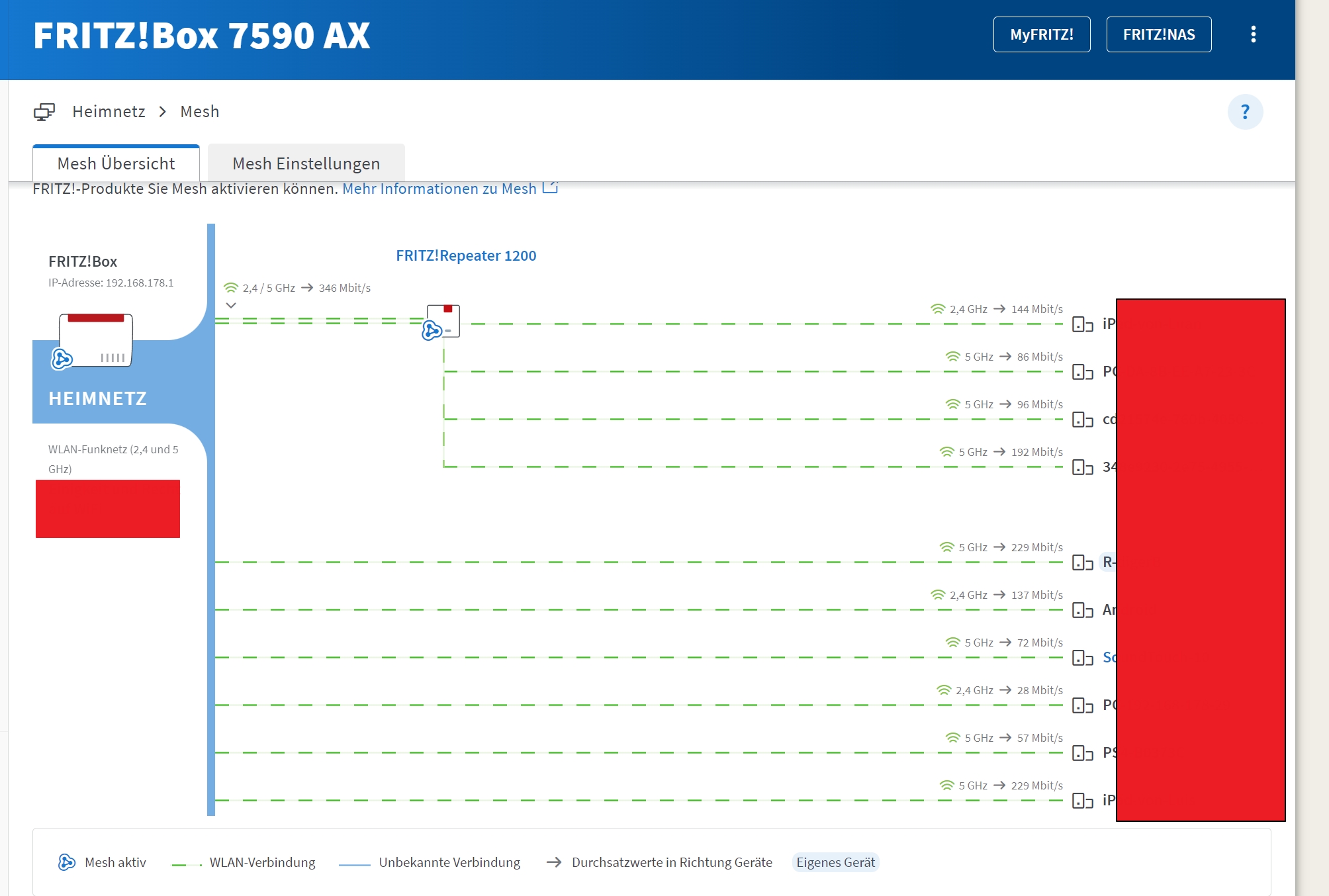 Das Notebook ist per LAN-Kabel mit dem FritzWLAN Repeater verbunden. Der Repeater ist per WLAN mit der FritzBox verbunden. Beide senden die gleiche SSID für 2,4 GHz und 5 GHz.