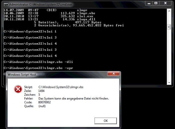 Den Lizenzstatus anzeigen mit slmgr -dli oder slmgr -dlv (in C:/windows/system32) gestartet, ergibt Fehlermeldungen (siehe screenshot). Versuche mit slui (1, 2, 3 oder 4) in C:/windows/system32 führen zur Meldung: Programm nicht vorhanden.