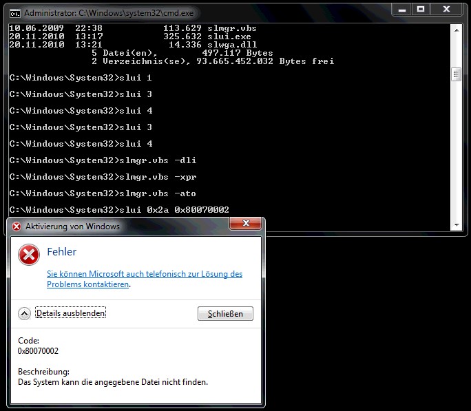 Versuche jetz mit slui (1, 2, 3 oder 4) in C:/windows/system32 führen zu diversen Fehlermmeldungen (Screenshots).