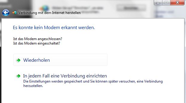 Wir haben zuhause den Anbieter gewechselt und damit auch ein neues Modem erhalten. Wir haben 8außer meinem) einen PC und ein Netbook zuhause. Bei denen konnten wir das Internet problemlos einrichten. Bei mir jedoch kommt die Meldung, dass kein Modem zum Verbinden bzw. Einrichten da ist. Am Modem kann es nicht liegen, da auf den anderen PC's Internet läuft. Wir haben vom Anbieter eine CD bekommen, mit der man WLAN manuell einrichten kann. Doch auch dort sagt er, dass er nicht mit dem Modem (Obwohl es angzeigt wird) verbinden kann.
