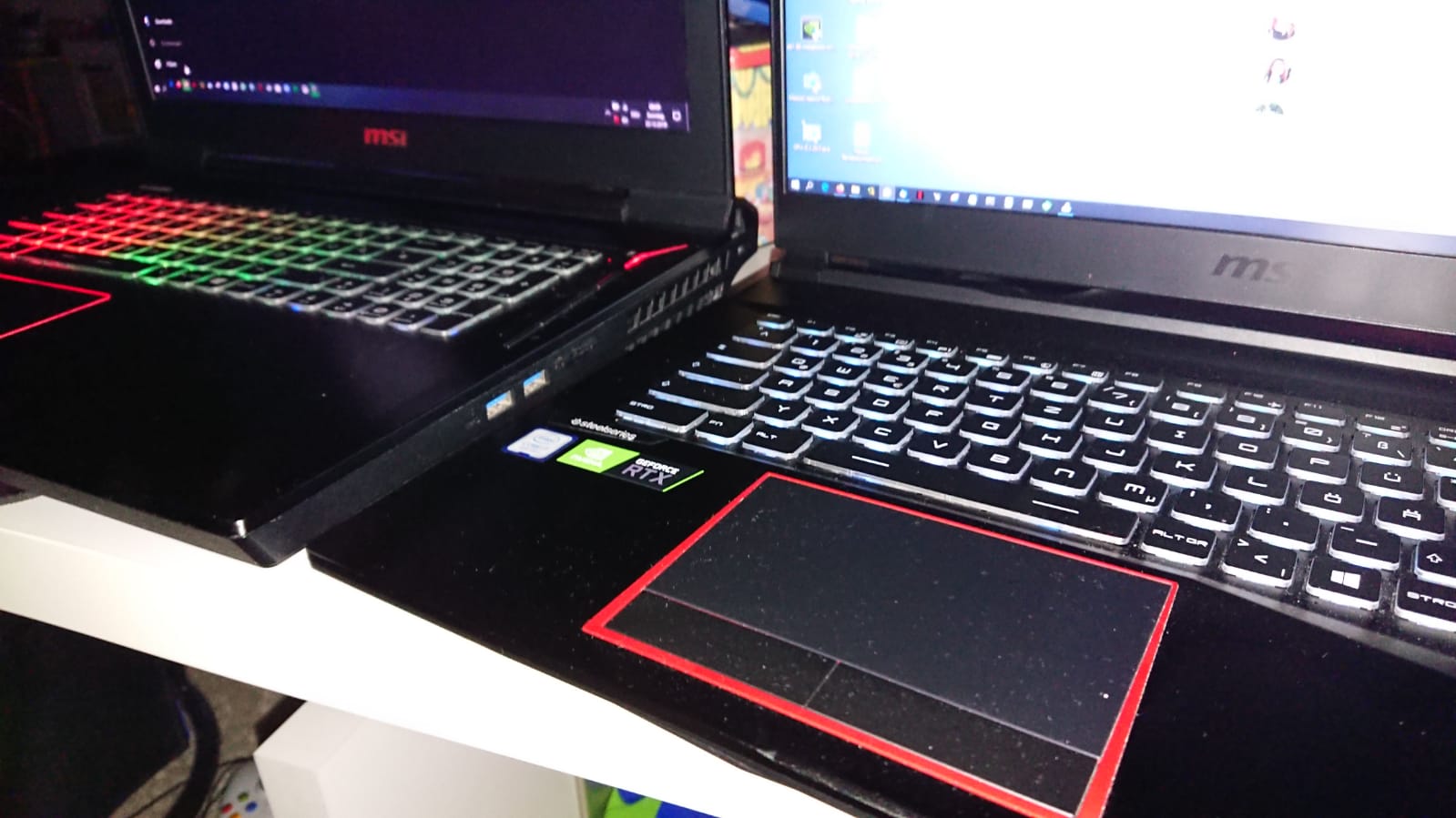 Und die Kunden wollen nunmal immer dünnere und leichtere Geräte haben, daher muss man halt an anderen Ecken sparen. Anbei mal 2 Fotos welche ich vorgestern gemacht habe. Es sind reine Gamingnotebooks, das linke ist ein 3 Jahre altes MSI GT73VR 6RE, dort steckt ein i7-6820HK, 32GB Ram und eine GTX1070 8GB drin, welche auch noch austauschbar ist und bei Bedarf kann man noch eine 2. Grafikkarte hinzufügen. Die CPU ist dort allerdings auch schon verlötet, besitzt aber einen freien Multiplikator und ist übertaktbar. Das rechte ist ein MSI GE75 8SG, dort steckt ein i7-8750H, 16GB Ram und eine starke RTX2080 8GB drin. Und genau da geht der Trend nunmal hin, so viel Leistung wie möglich in einem schönen kleinem Gehäuse... Der Grössenunterschied ist schon enorm, obwohl beides 17.3" Geräte sind ! Und das funktioniert nur, wenn man z.B. die Bauhöhe verringert indem man gewisse Sachen wie z.B. den Sockel einspart.