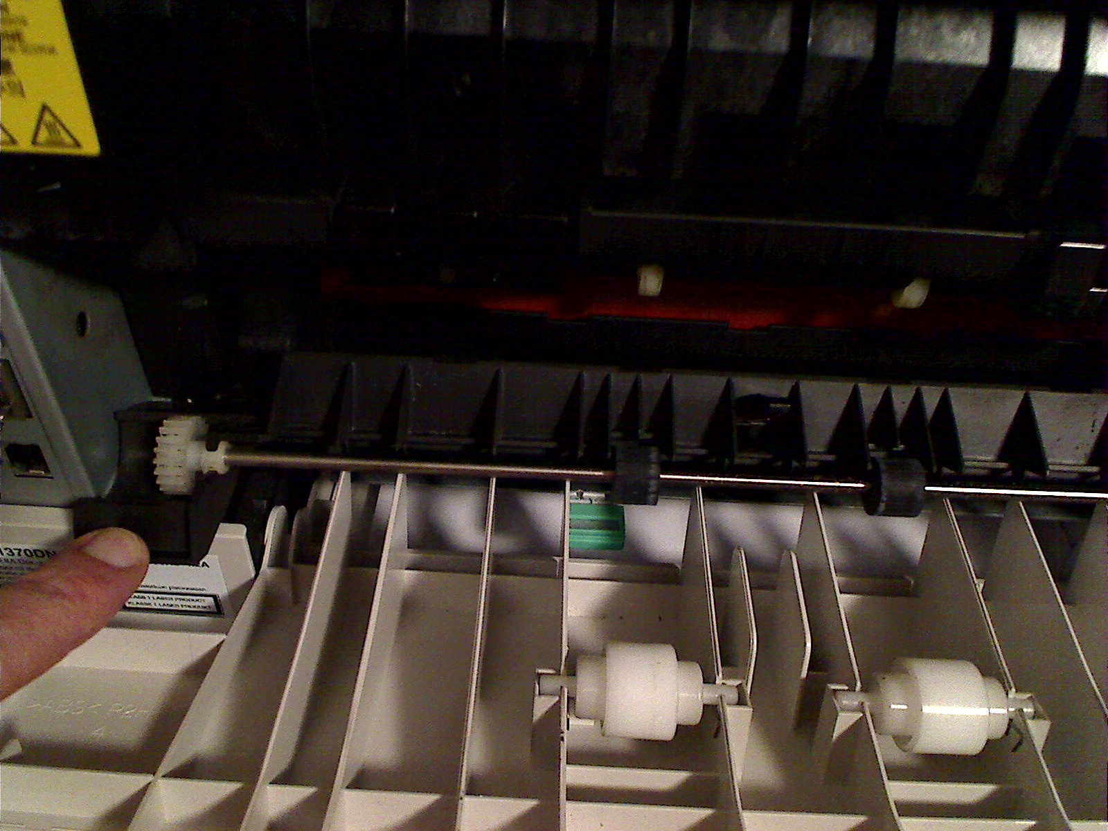 Ich kann hinten unten (nach Öffnen der Klappe) dann ein federndes Teil runterklappen und sehe dann die rote Walze. Ich kann sie mit dem Finger drehen/weiterschieben, mit dem einen weißen Zahnrad links bei dem runtergeklappten Teil geht das nicht, das bewegt nur die dünne Metallstange mit den zwei kleinen Gummirollen.