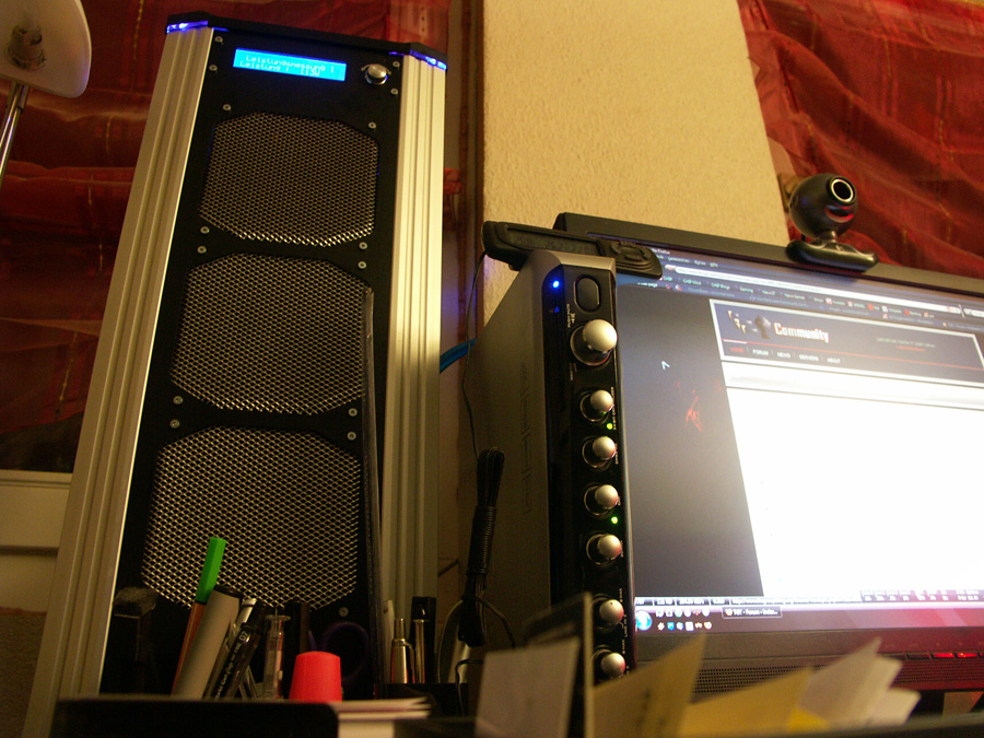 Beim PC-Gehäuse handelt es sich um ein Thermaltake Armor mit 4*120mm Zalman (Red LED) (jeweils ca 1000 U/min --> so gut wie nicht wahrnehmbar) und 1*92mm Zalman (Red LED) (ca 1300 U/Min --> so gut wie nicht wahrnehmbar) an einem Scythe Kaze Master.