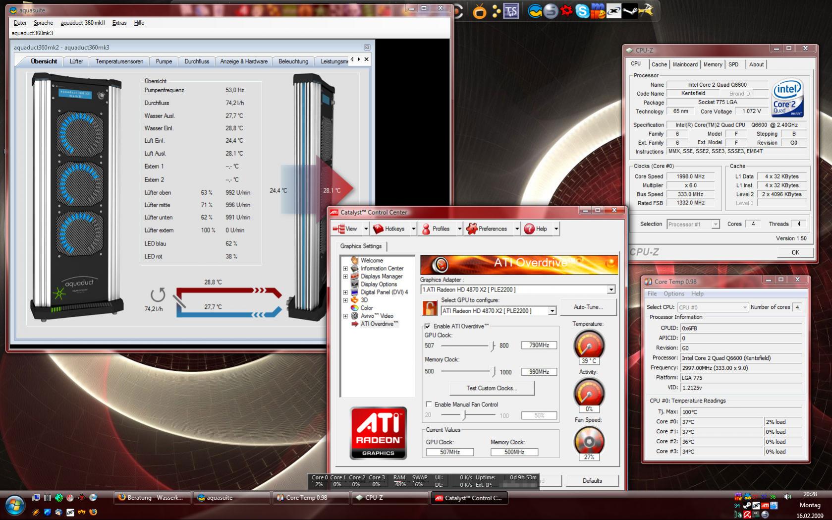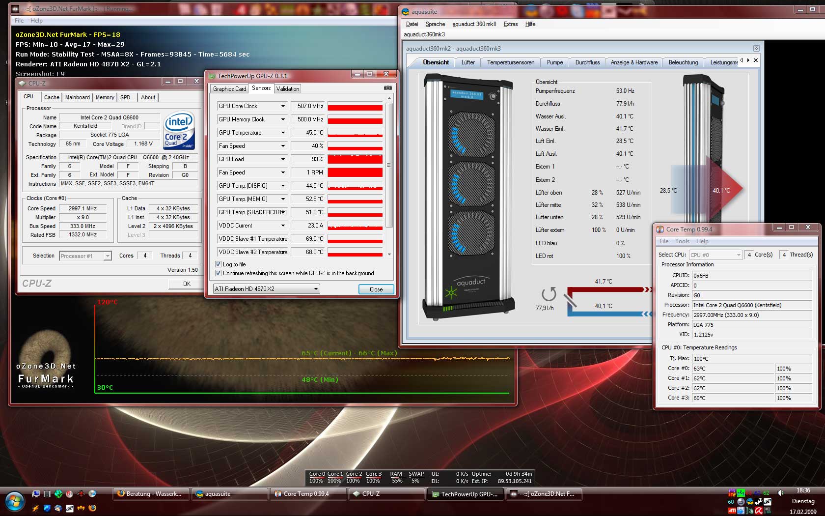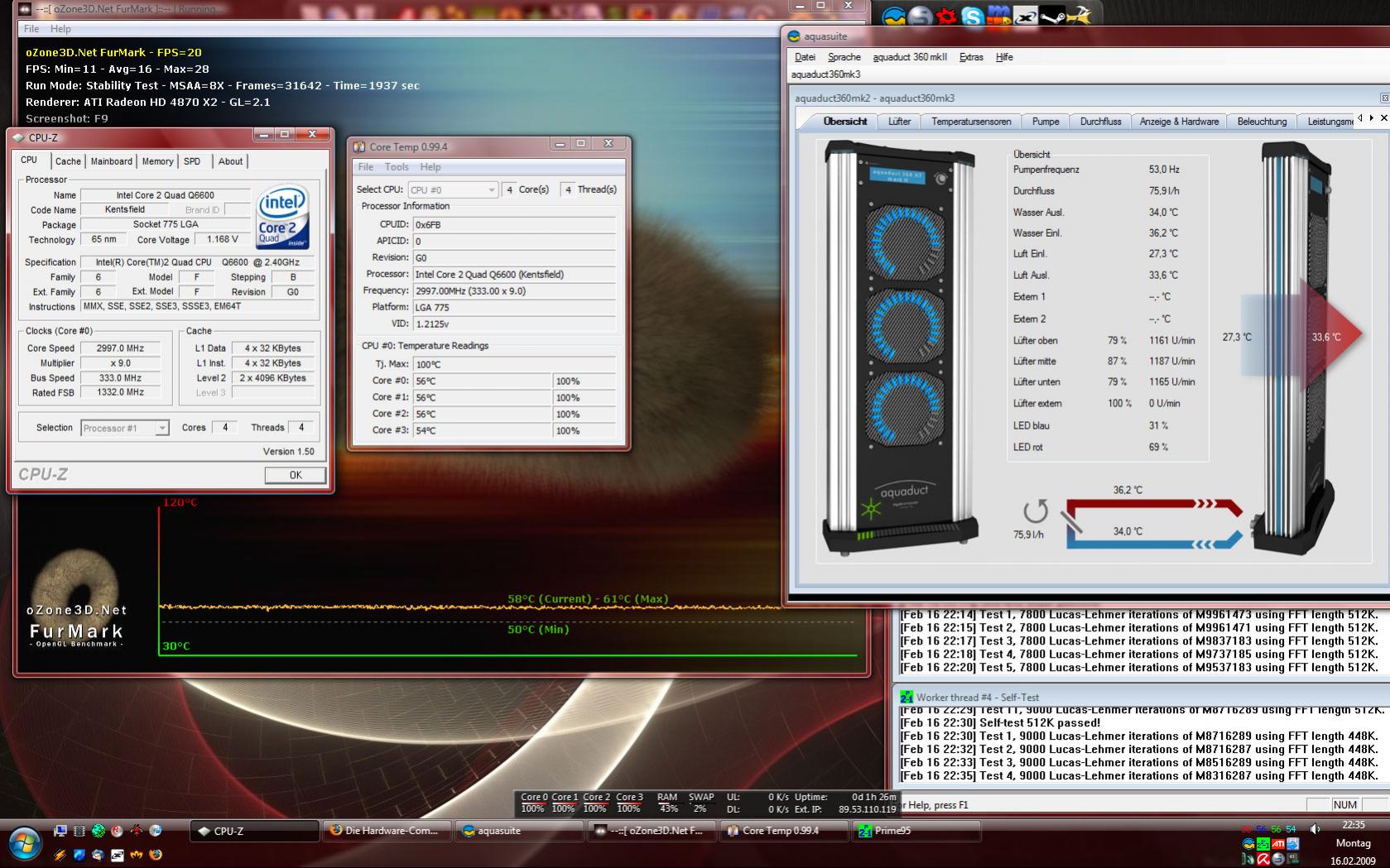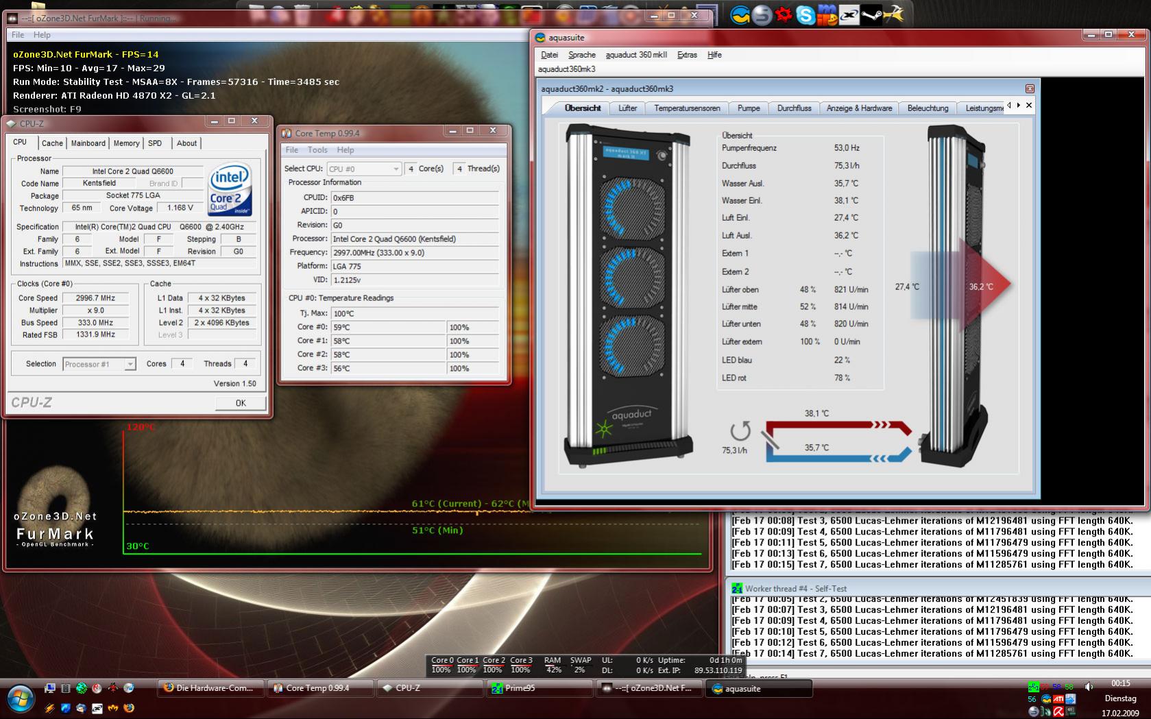 Das System lief so lange unter Volllast (CPU Belastung mit Prime für etwa 1,5h, und Furmark (Stabilitätstest bei 1024*768, 8xMSAA)) bis sich die Wassertemperatur 15 Minuten lang nicht verändert hat.