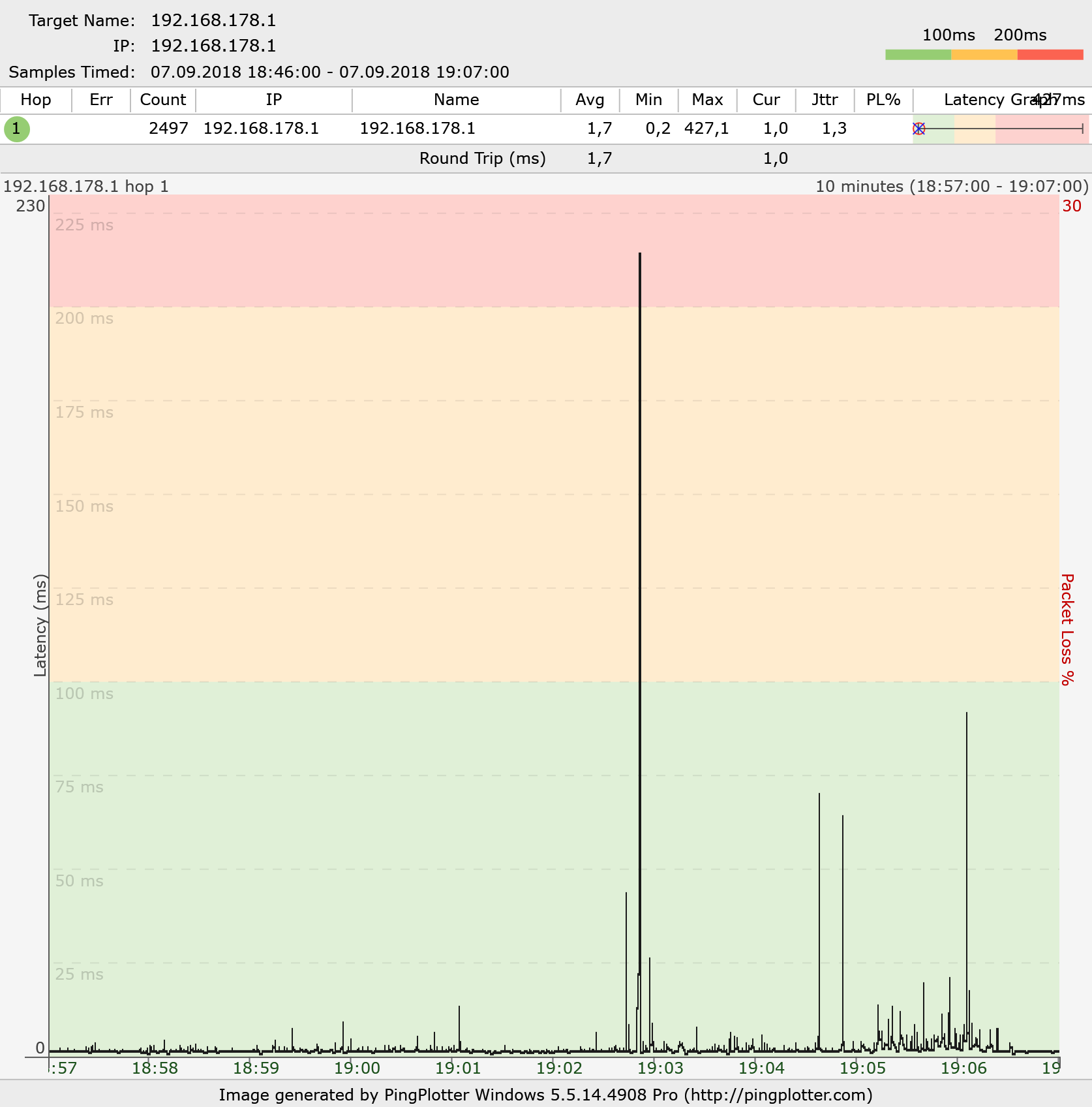 Aber selbst wenn ich alleine daheim bin, NUR mein Rechner im Netz ist und selbst das Handy auf Flugmodus geht der Ping (auch fast egal welche Uhrzeit) mal stark hoch um dann wieder zu fallen. Ich habe durch meine 2 Monitore auch mal den Ressourcenmonitor mitlaufen lassen dort wird mir aber kein Programm angezeigt was dann zu diesem Moment viele Daten frisst.