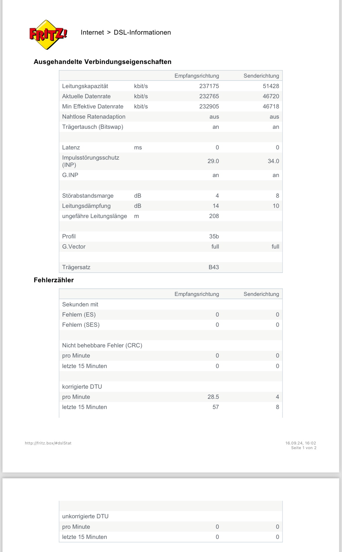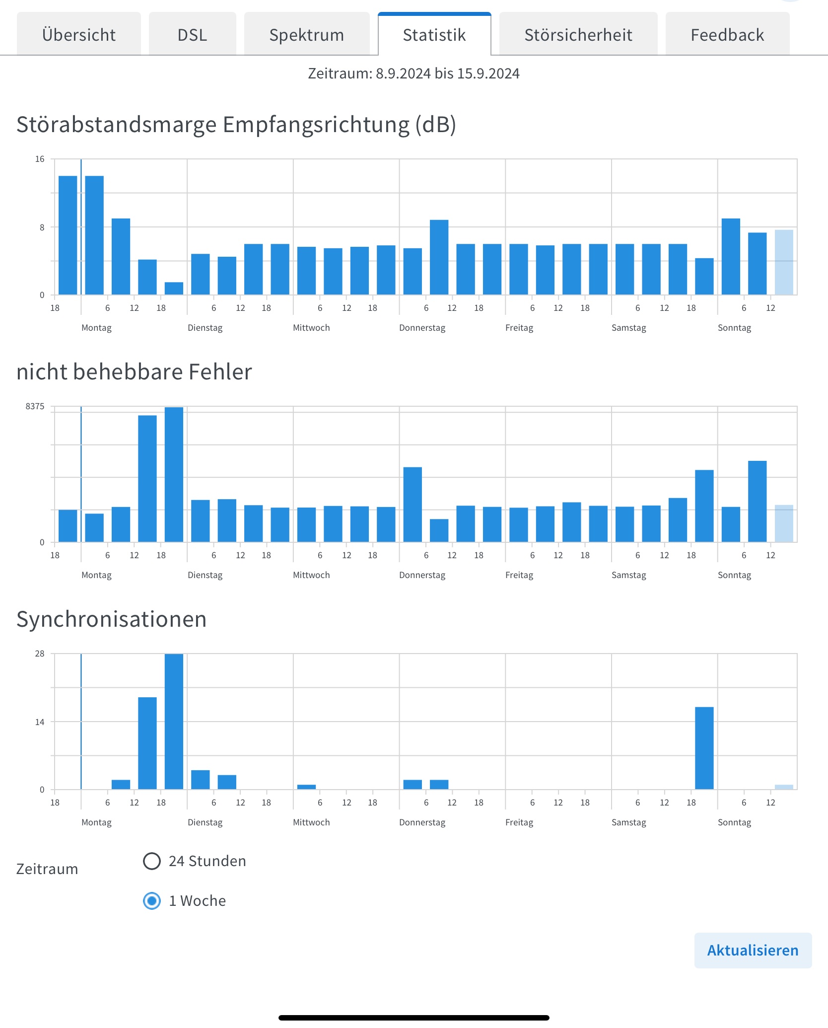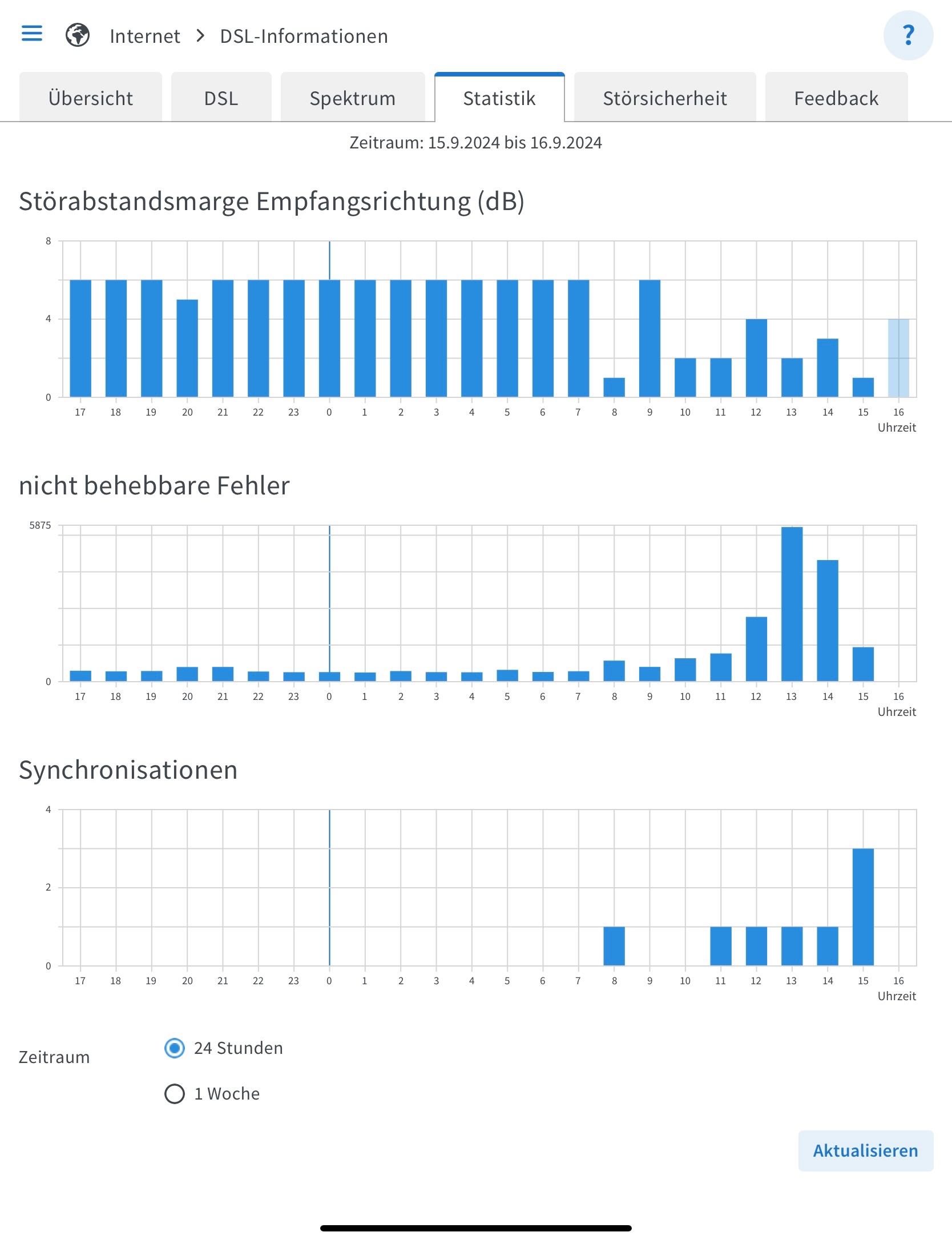 ich bin vor kurzem in ein Mehrfamilienhaus umgezogen und habe eine 250er Leitung von 1&1. Leider verliert die FritzBox immer wieder die Internnetverbindung. Überwiegend Abends so ab 21/22 Uhr, über mehrere Stunden kann die Verbindung dann alle paar Minuten abbrechen. Manchmal auch mitten am Tag, so wie heute. An 2 Tagen HomeOffice musste ich schon auf den HotSpot am Handy umsteigen.