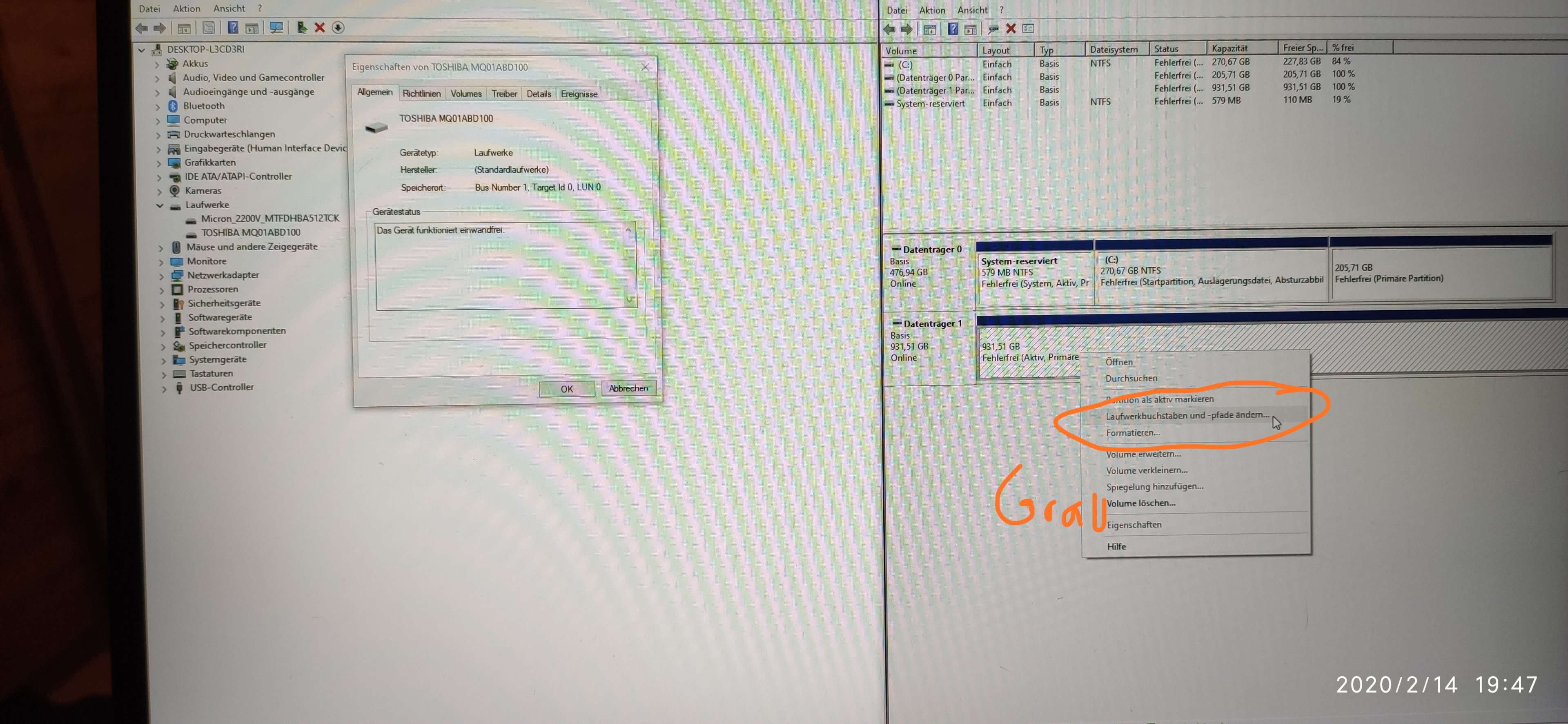 Wenn Ich dies aber in der Datenträgerverwaltung machen will, dann ist da alles ausgegraut, Bild folgt.