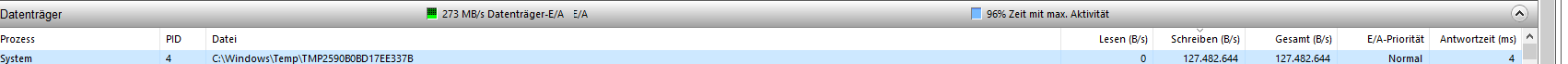 mein Windows 10 Pro PC schreibt seit dem 21.04.2020 permanent auf das Laufwerk C: (eine SSD) und löscht die Daten dann wieder. Der System-Prozess geht sofort los wenn Windows hochgefahren ist, ich habe keine Ahnung was da passiert. Meine SSD wird da durch zerstört. Ich habe keine Ahnung was da geschrieben wird und wohin. Ich habe weder Updates, noch Programme installiert und nichts geändert. Das ich mir Viren o.ä. eingefangen habe, halte ich für sehr unwahrscheinlich.