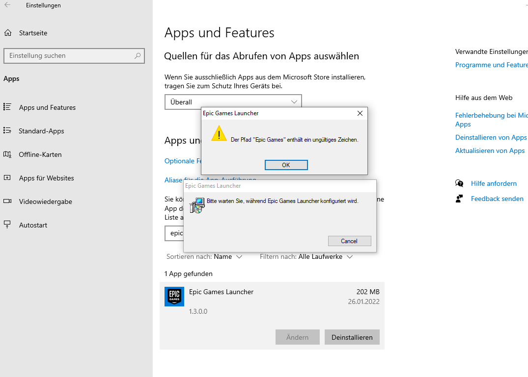 Ich hatte meine HDD mit einer neuen SSD ausgetauscht, aufgrund eines Defektes, habe festgestellt, dass ich den alten Laufwerksbuchstabe D nicht verwenden kann und gehe davon aus, dass ich auch den Epic Launcher deswegen nicht deinstallieren kann, welcher eigentlich auf C gespeichert war, aber irgendwie scheint die fehlende Festplatte zu stören