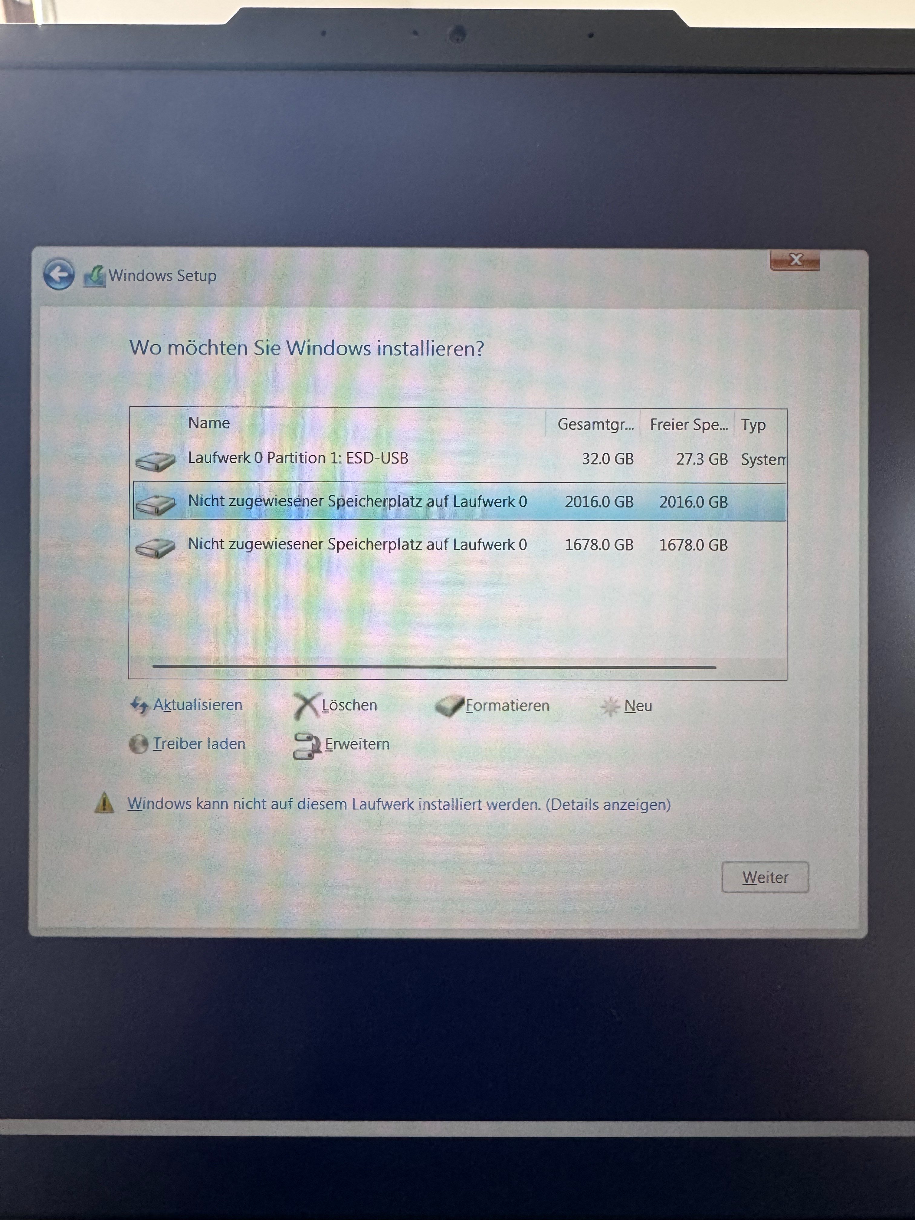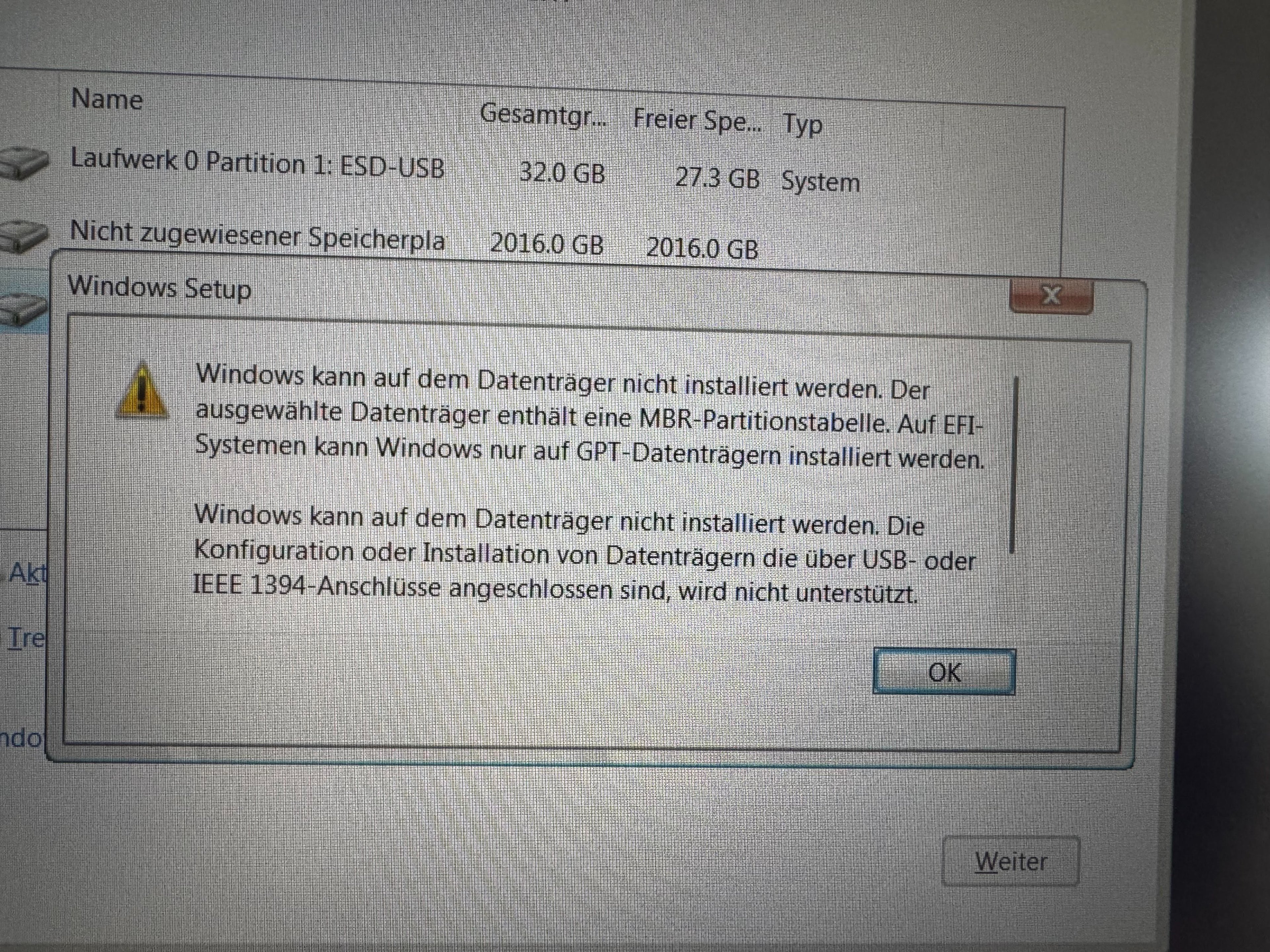 Hier kommt die Meldung "Nicht zugewiesener Speicherplatz auf Laufwerk 0".