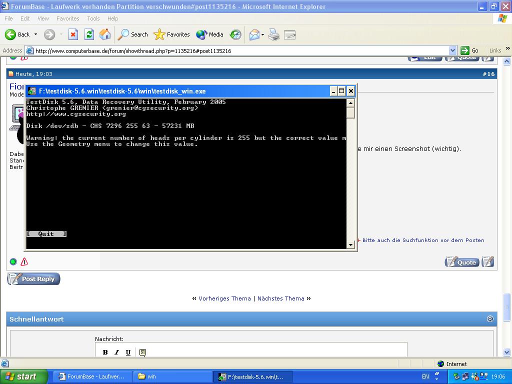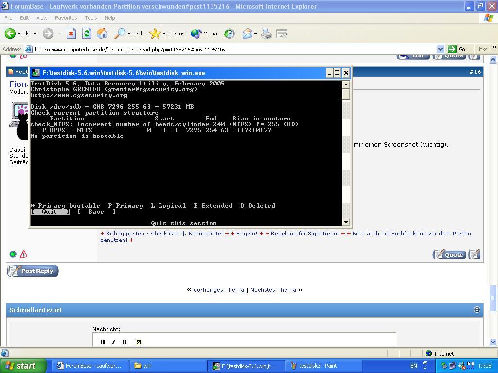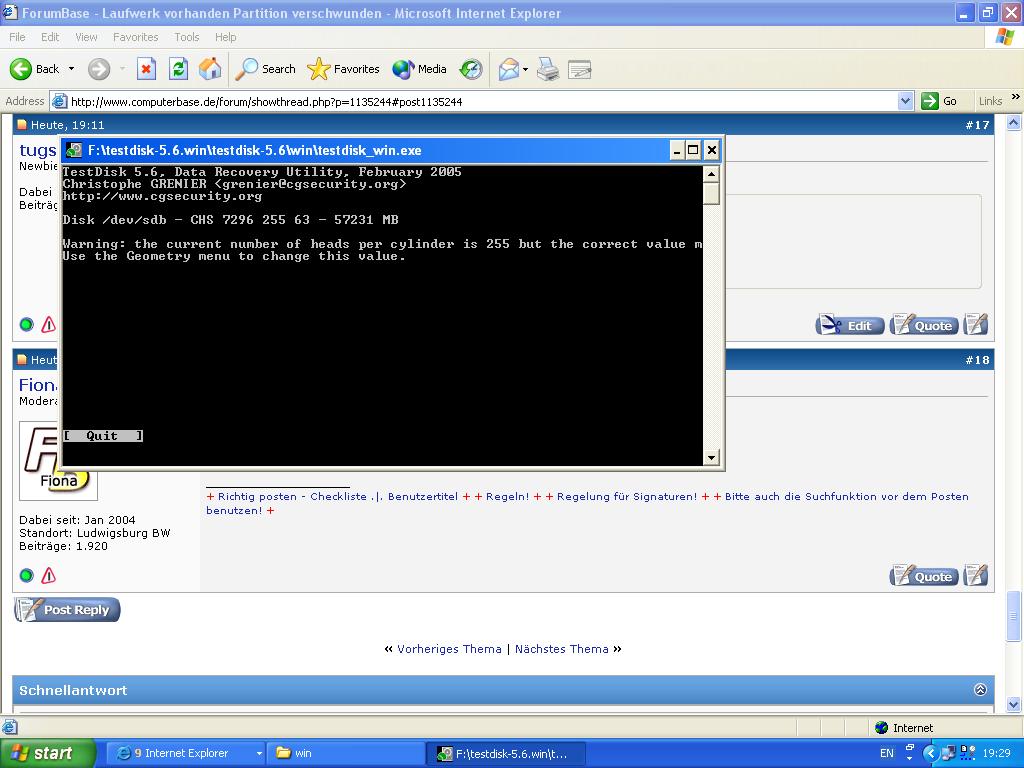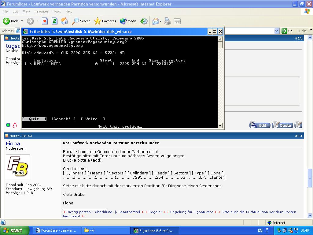 Ich habe ein Problem mit meiner externen Festplatte (ieee 1394 und usb2). Die Partition darauf ist verschwunden. Explorer (in windows xp sp2, sonst keine merklichen änderungen oder zusätze) zeigt zwar noch die Fesstplatte an (Eine WD 240 gig) aber sagt sie sei unformatiert. Hatte auch schon versucht sie direkt an einen IDE port anzuschließen, jedoch mit dem selben problem (dies geschah in einem Rechner mit sp1, somit schließt sich ein fehler vom sp2, sowie des controllers aus). Die Festplatte funktionierte noch am Vortag und die daten wurden während des Bestriebes nicht mehr erreichbar. Falls es noch dazugehörte, ich wollte eine Sicherung auf DVD machen, das Programm (nero in einer 6.x version) brach ab, weil der Datenastrom abries. Ich schob dieses Problem daraus, dass ich noch auf der partition eine Datei entpacken wollte. Dies brach jedoch ab, da das Archiv koruupt war. Nach einen neuanschluss der Partition ging die Datei zwar wieder, jedoch war ein folder das ich sichern wollte leer, ging auf suche und irgendwann hatte sich dann die Platte selbstständig abgemeldet. Nach einem erneuten start war die Partition verschwunden, und es hieß der Datenträger sei unformatiert. Nun ist meine Frage wie ich die Partition wieder herstellen kann, da doch noch gut 20 gig an Daten darauf sind (war meine Backup-platte und die original files sind leider schon auf der C: Platte gelöscht).