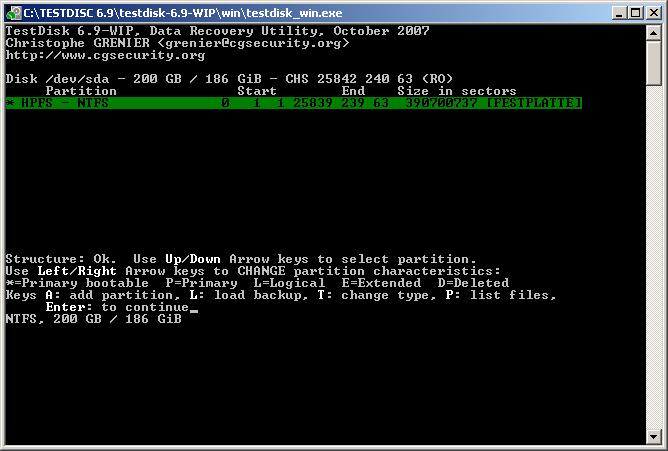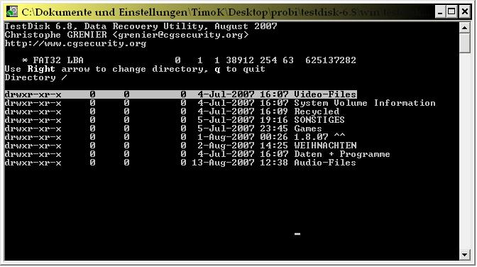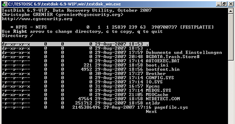Wenn du p drückst und bei einer NTFS-Partition eine Daten siehst, kannst du eine Datei oder Ordner markieren und c für copy drücken.