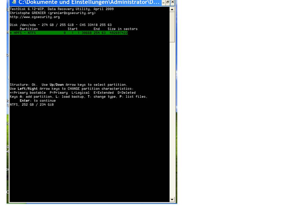 Wenn jetzt Partitionen (sie sollten jetzt u.U. grün dargestellt werden) gefunden werden, solltest Du sie wieder mit den Cursor Tasten auswählen und mittels