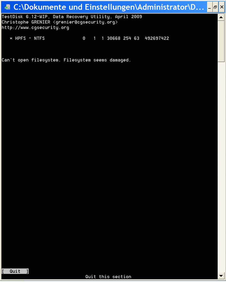 Q geht es zurück ins Menü. Sollten keine Partitionen in der ersten Suche gefunden worden sein, wird mit