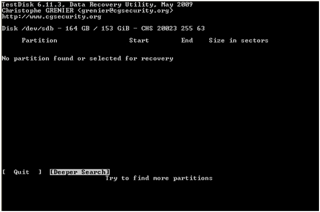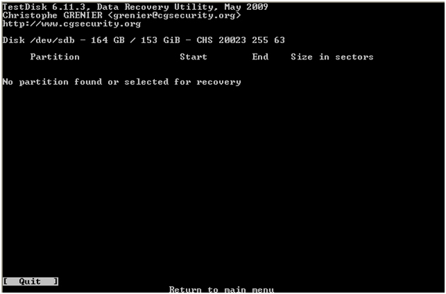 Q geht es zurück ins Menü. Sollten keine Partitionen in der ersten Suche gefunden worden sein, wird mit