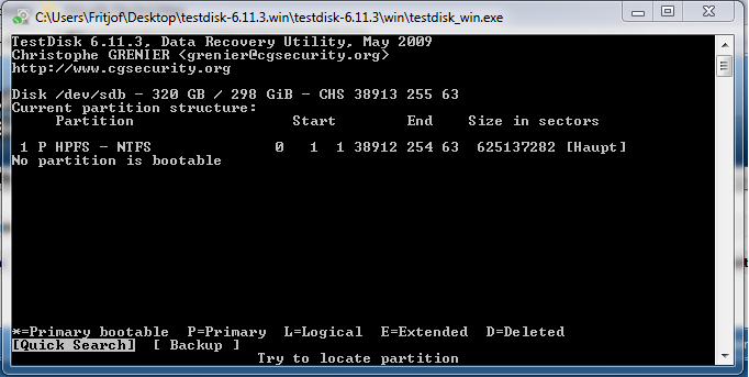 Plötzlich wurde das Laufwerk nichtmehr angezeigt und er fragt mich ob er formatieren soll. Darauf hin habe ich hier ein wenig gelesen und mir Testdisk (6.11.3) besorgt.