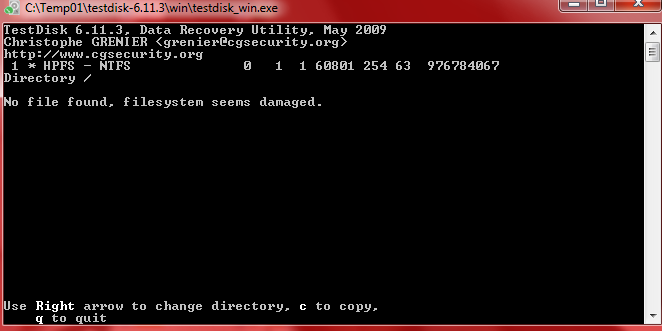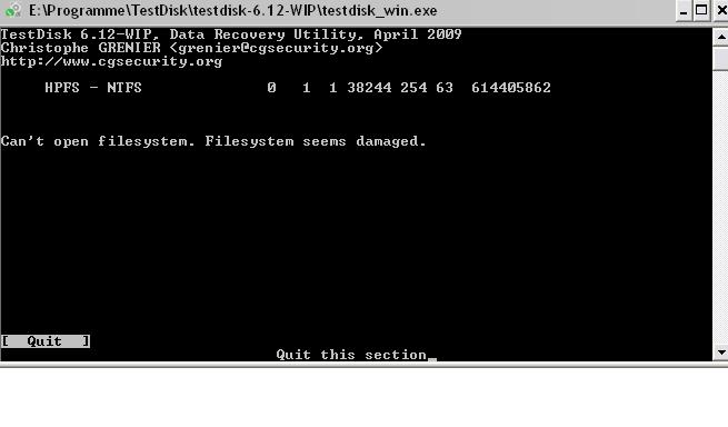 Nach dem, was du anangs beschrieben hast, habe ich mit TestDisk einen Screenshot erstellt, den ich unten anghängt habe (bzw. siehe link: http://www.fileuploadx.de/947437) . Leider kenne ich mit dem ganzen absolut gar nicht aus und weiß nicht wie ich fortfahren soll. Als Partition habe ich Intel genommen. Ist das so richtig? Was besagt diese Partition?
