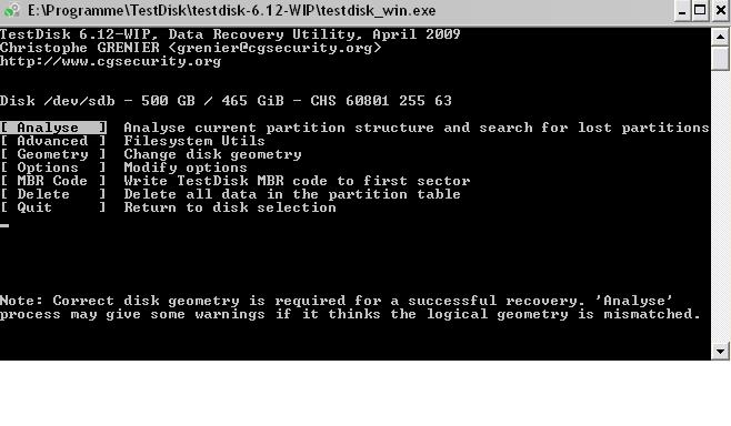 Nach dem Start von Testdisk beantwortest Du die Frage nach einer Logdatei mit Y. Den Partitionstyp solltest Du mit Intel beantworten. Dann wird Analyse aus dem dann erscheinenden Menü gewählt. Mit Quick Search wird dann der Vorgang fortgeführt (bei Vista mit Y antworten, wenn die Partitionierung unter diesem OS gemacht wurde).