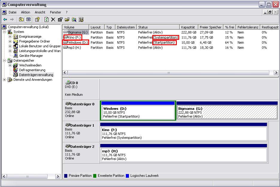 Ab in den partitions manager von Windows . Da stand dann wirklich das meine System platte D: ist und meine Daten platte D: ich verwende ein Raid 0 von 80Gb platten welche in so gesplitten wurden 15Gb C: und D: rest. Jetzt meine Frage wie bekomme ich die Bustabenn wieder getauscht, das WIndows wieder normal bootet. Das Prob ist das ich noch bis 14 uhr audf der Arbeit bin danach hab ich ich kein Internet mehr und werden steinigen weg der formatierung gehen da mir nix einfällt.