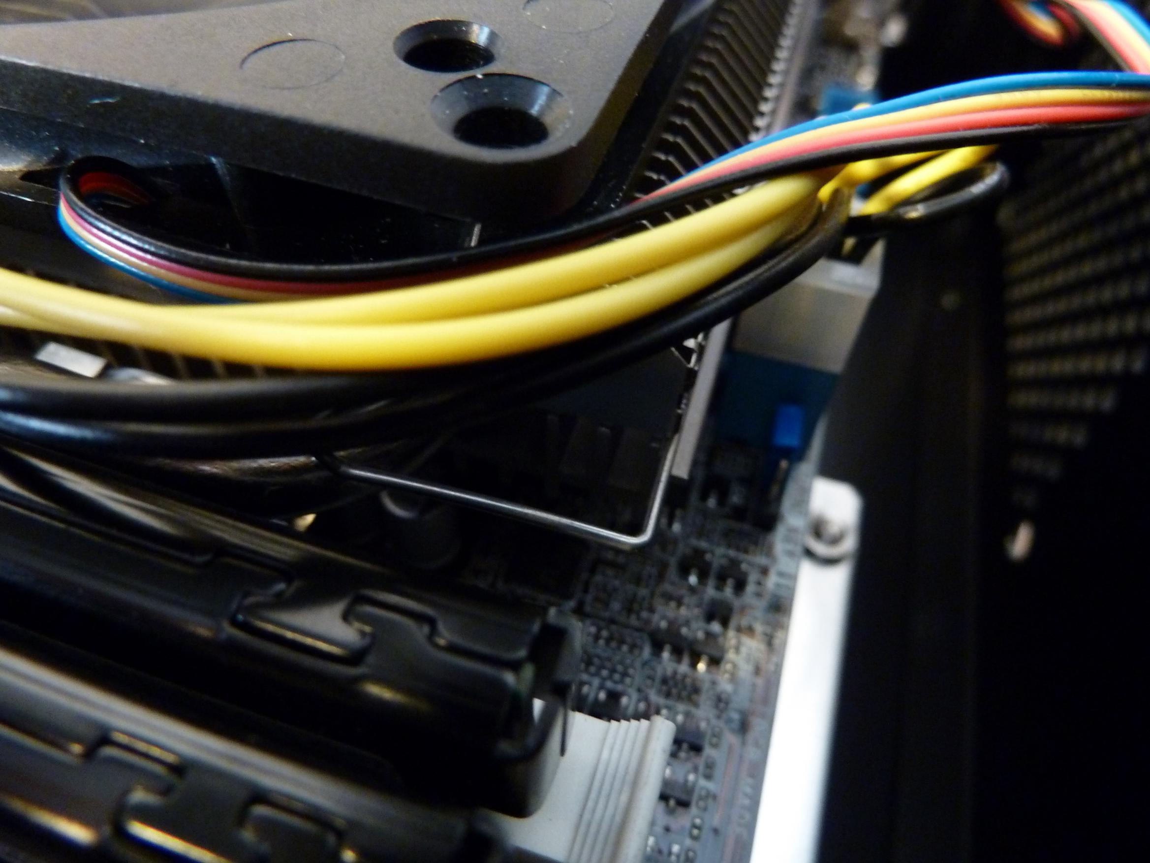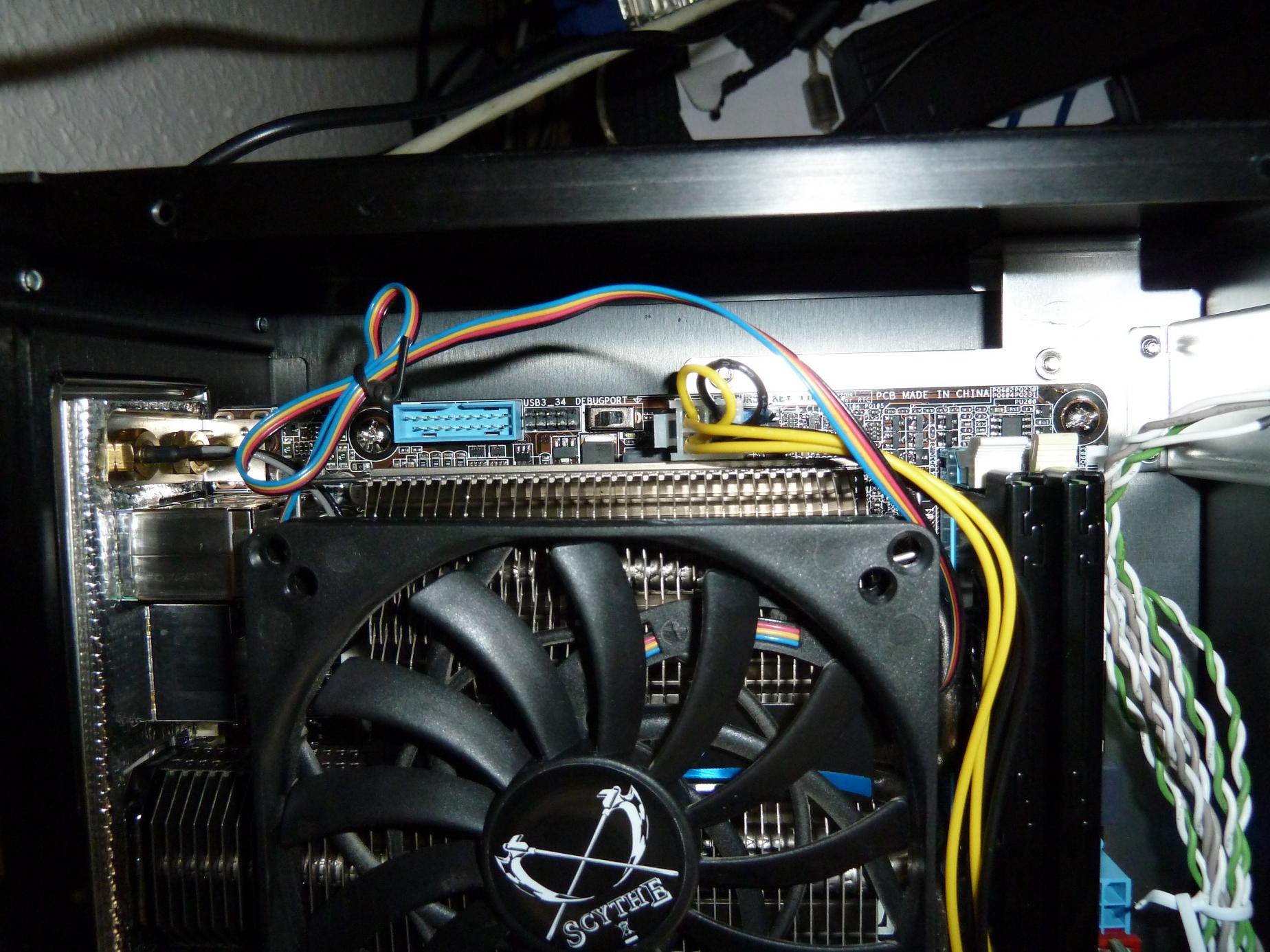 Zum anderen habe ich mir noch etwas wegen dem Lüfter überlegt. Ich habe vor dem Kauf schon gelesen, das auf den Passivkühler vom Board kein 25mm dicker Lüfter passt, da Fehlen leider ca. 3 mm. Ich habe aber noch den Scythe Shurikan, mit dem Slim Lüfter den ich nutzen kann. Dieser besetzt auch noch einen PWM Anschluss. Die Frage ist nur: Wie mache ich den nur fest?! Also habe ich mir den Passivkühler mal angeguckt und Kanten an den Seiten entdeckt und mir gedacht, das ich diese einfach mal so nutzen kann, wie es beim Original Scythe funktioniert. Mit etwas fummeln, hat das dann geklappt. Der Lüfter pustet Richtung Motherboard.