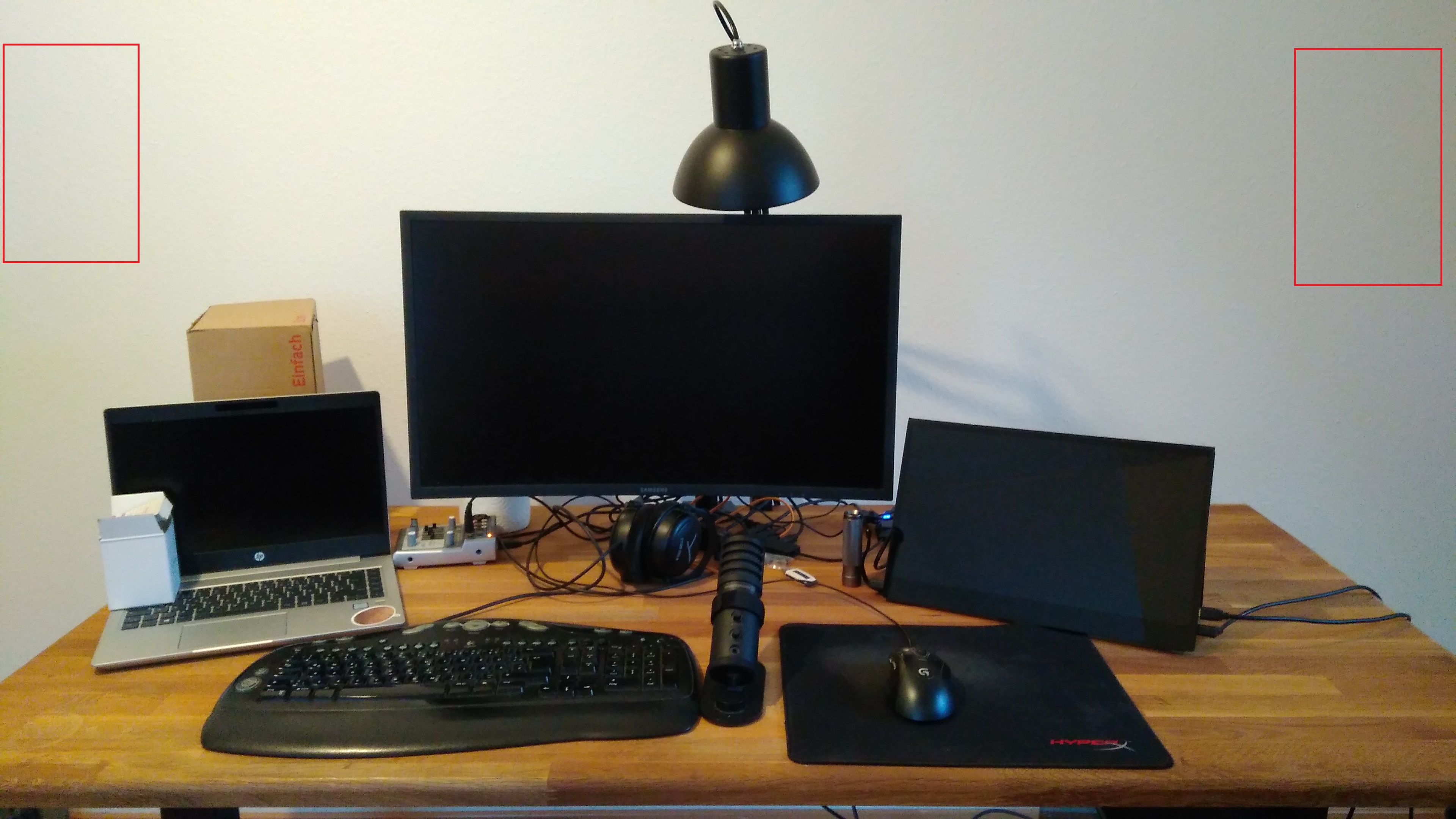 Deswegen sollen die Boxen entweder direkt auf dem Tisch stehen oder via Mount etwas erhöht werden. Auch, dass gerade alles etwas nach links verrückt ist, bitte ignorieren. Die Raumgröße beträgt ca 14m² mit einigen Dachschrägen.