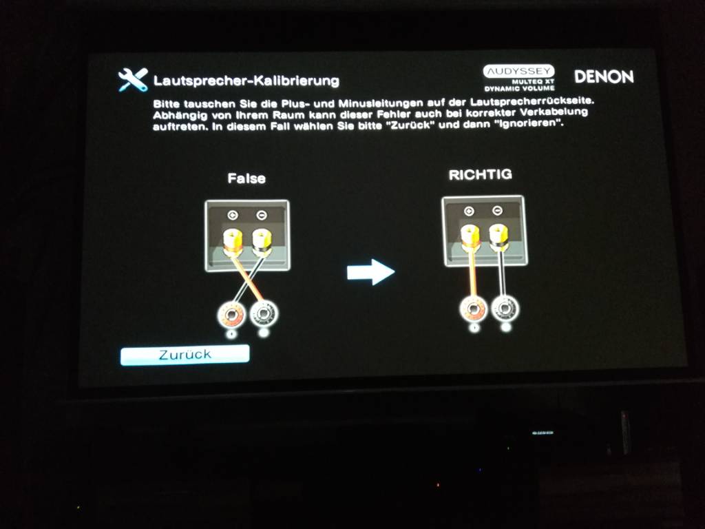 Ich habe dann an den Frontlautsprechern die schwarzen Kabel in die rot-markieren Anschlüsse gesteckt und die roten Kabel in die schwarz-markierten Anschlüsse. Damit hat es funktioniert.
