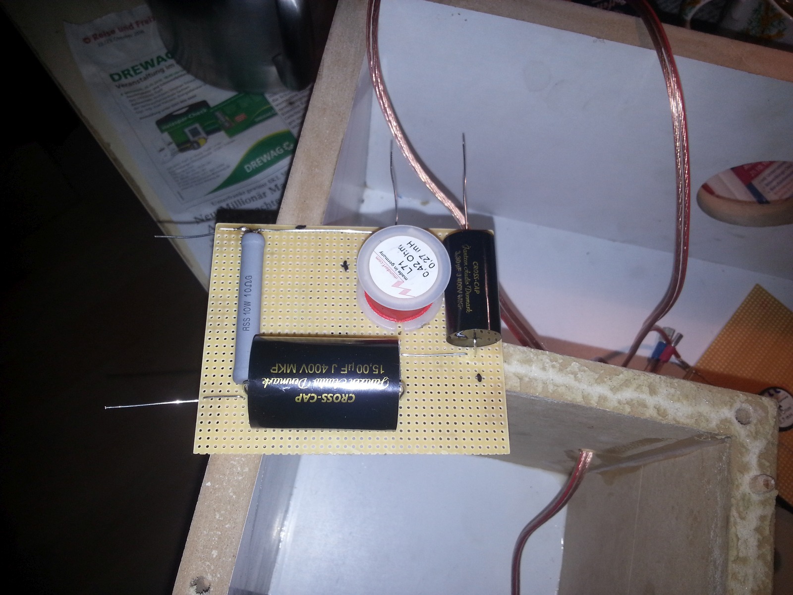 Apropos Weiche, die Spule dem einen Teil der Weiche hängt über, weil ich grandioser Weise zwei Spulen miteinander vertauscht habe und dann letztendlich nochmal, 0,27 mH sehen 2,70 mH auch verdammt ähnlich XD.