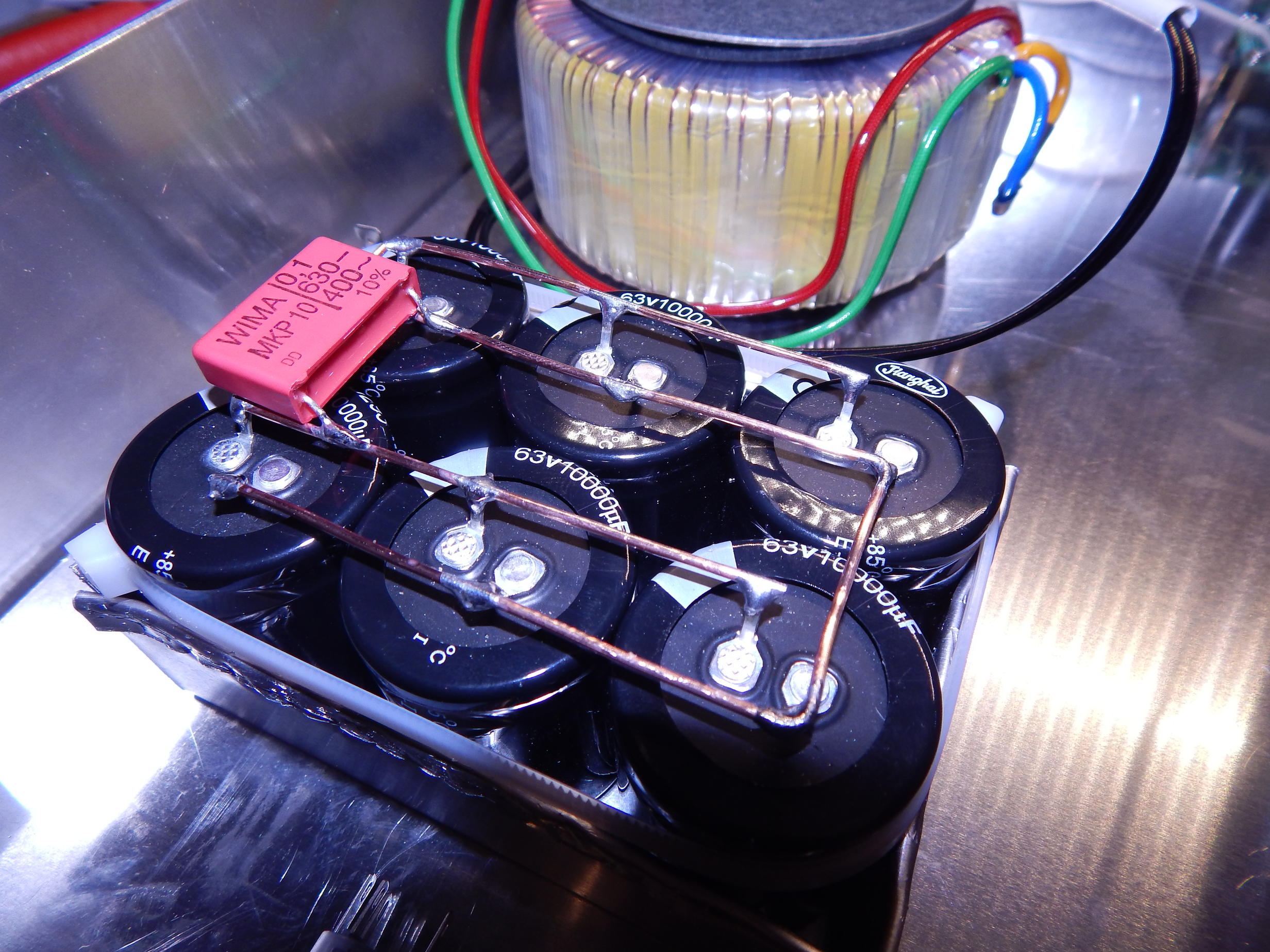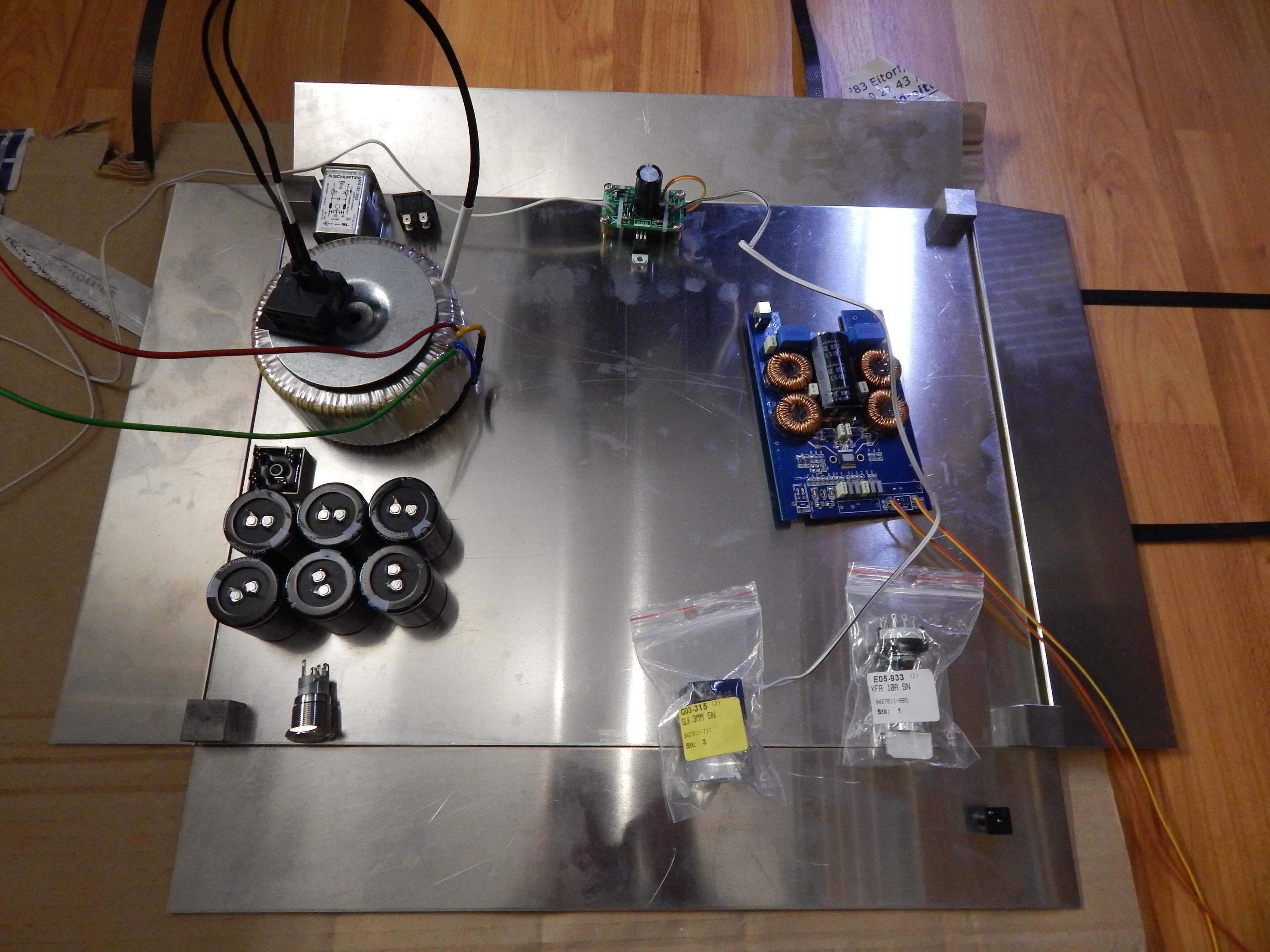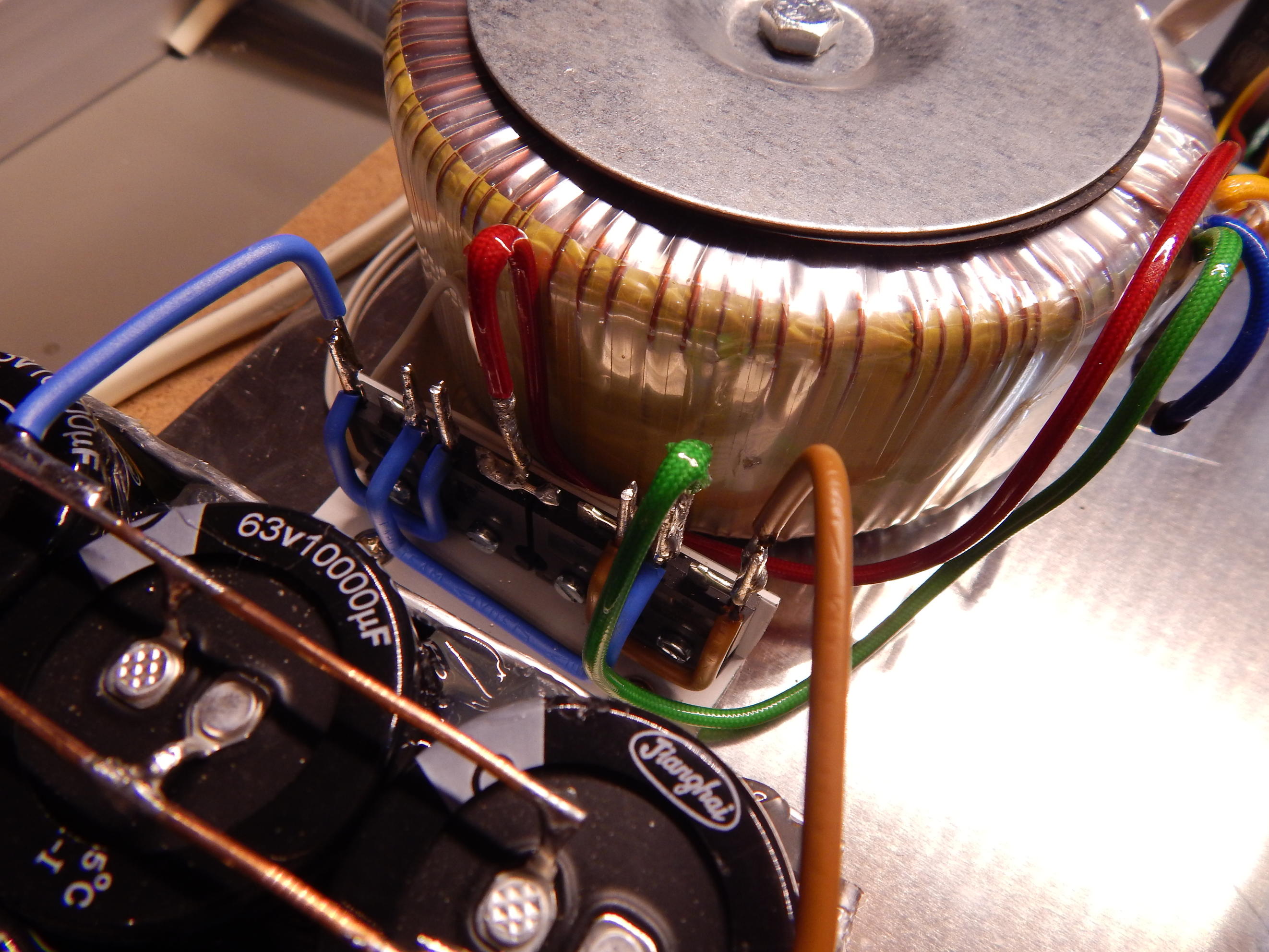 220VA Ringkerntrafo, mit insgesamt 0,68F Siebung dahinter. Erst ohrenbetäubende Lautstärken (100W Sinus pro Kanal sind drin bei der Versorgungsspannung) sorgen für leichte Welligkeit der Eingangsspannung. Außerdem ist der TDA7498E zusätzlich gegengekoppelt.