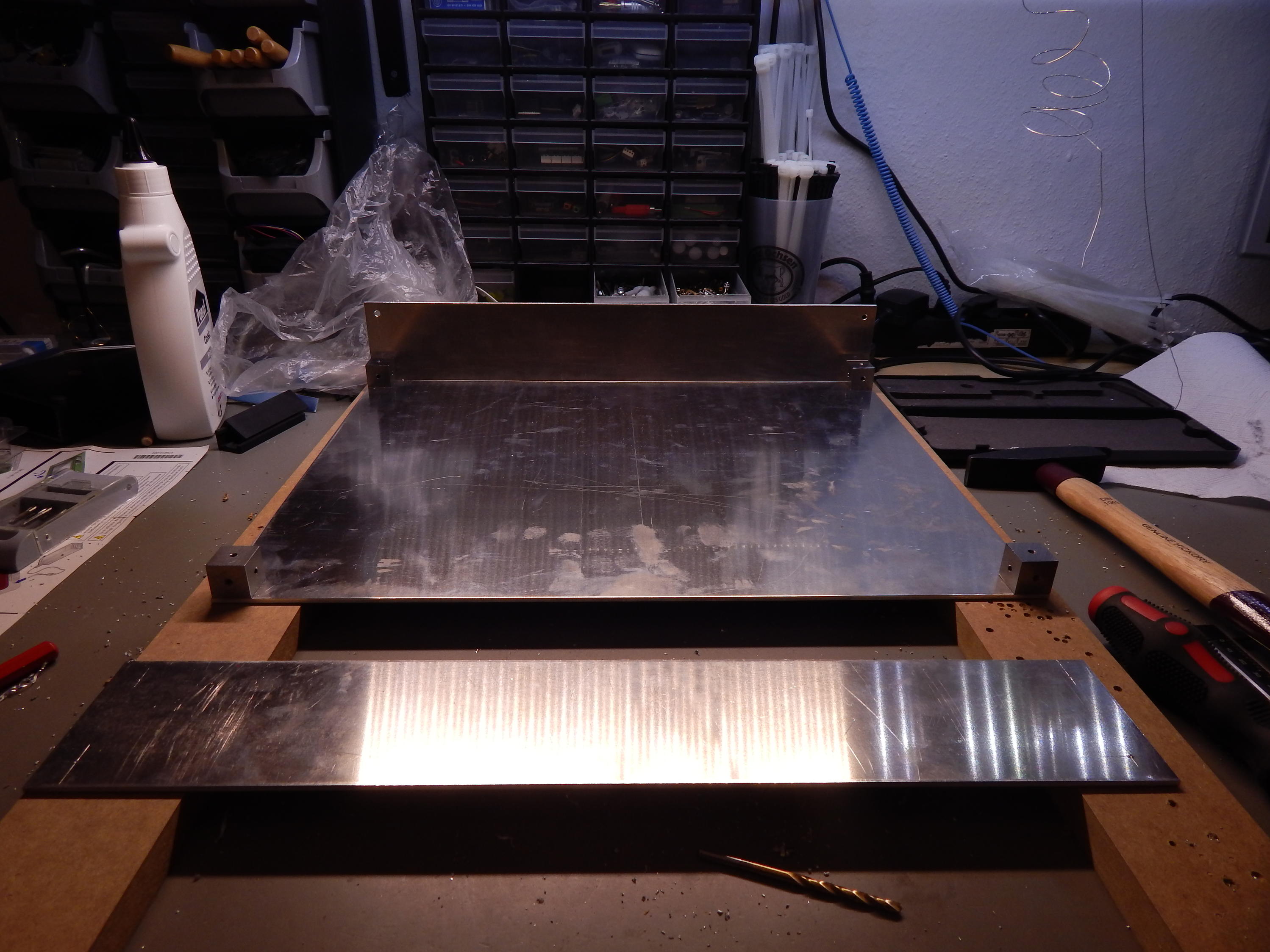 Das Gehäuse sollte ein recht einfaches Schalengehäuse ohne Innengerüst werden. Hierfür reicht bei diesen Ausmaßen 3mm Aluminiumblech. An den Ecken werden diese mit 20x20mm Gewindewürfeln verbunden.
