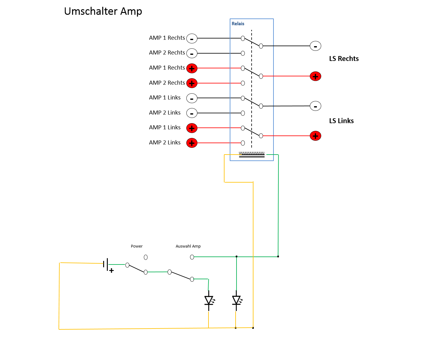 Und da die Kippschalter Ein-Aus-Ein Wechsler sind, erfolgt die Umschaltung der Verstärker galvanisch getrennt.