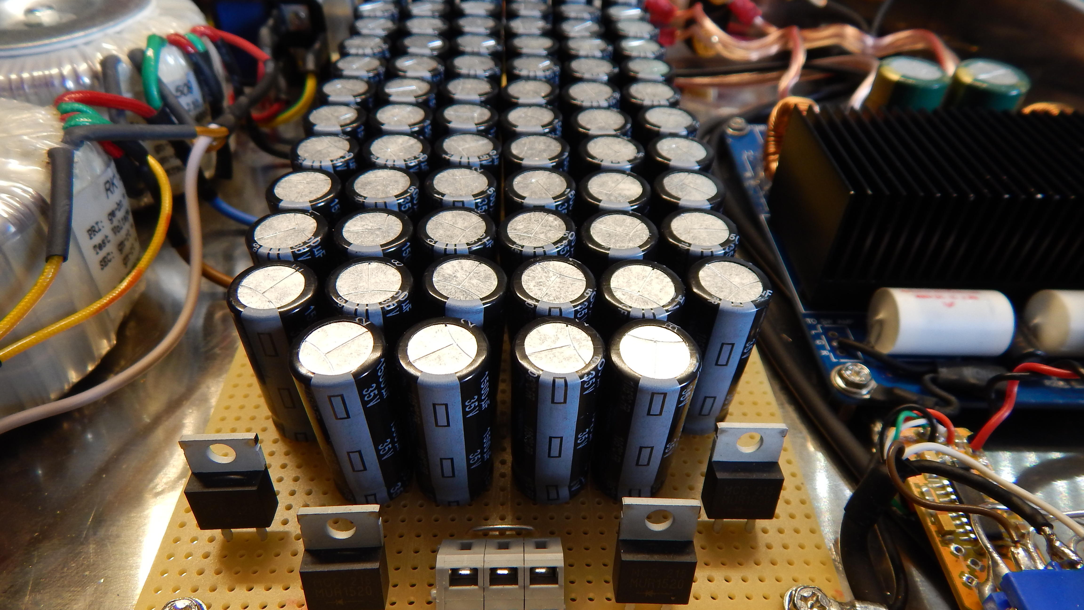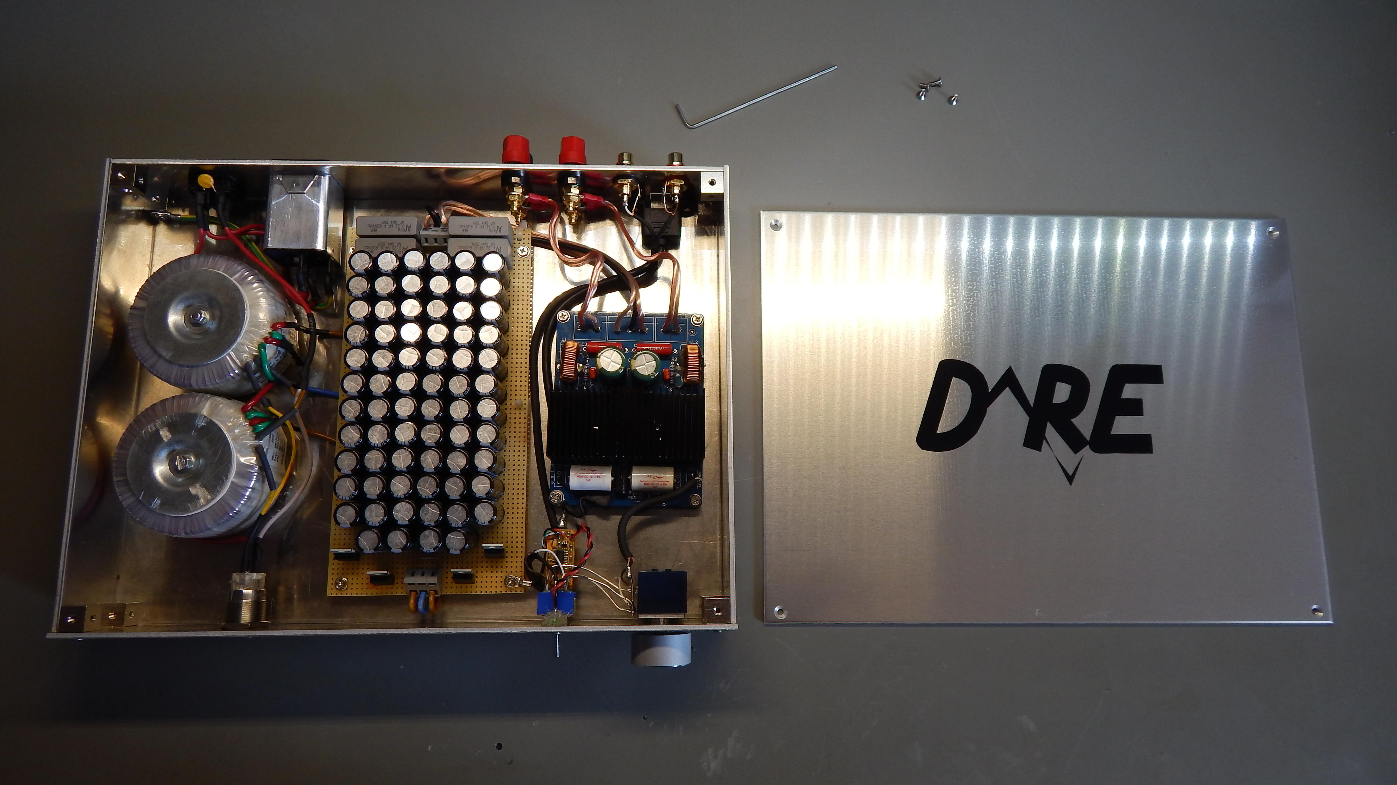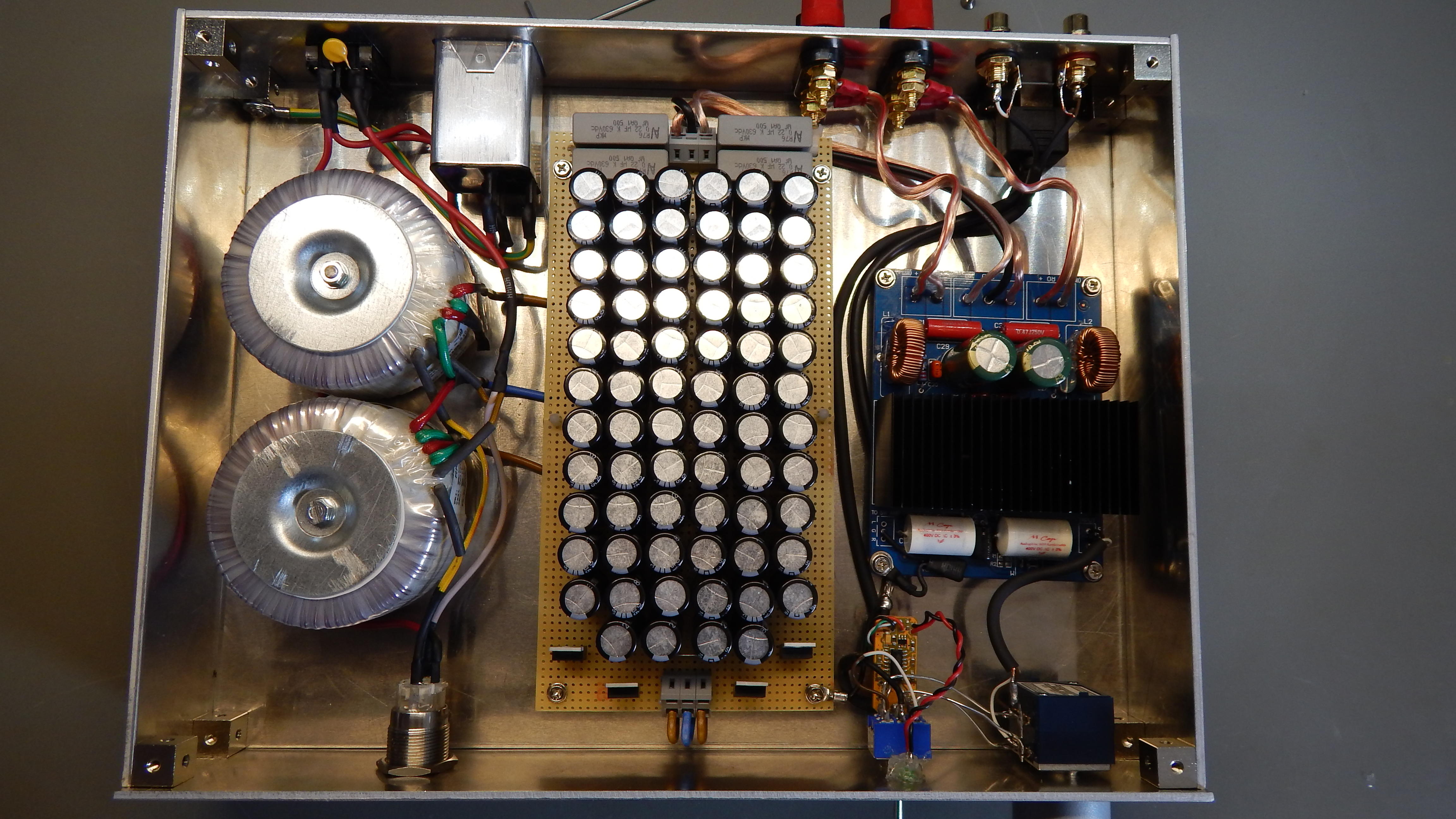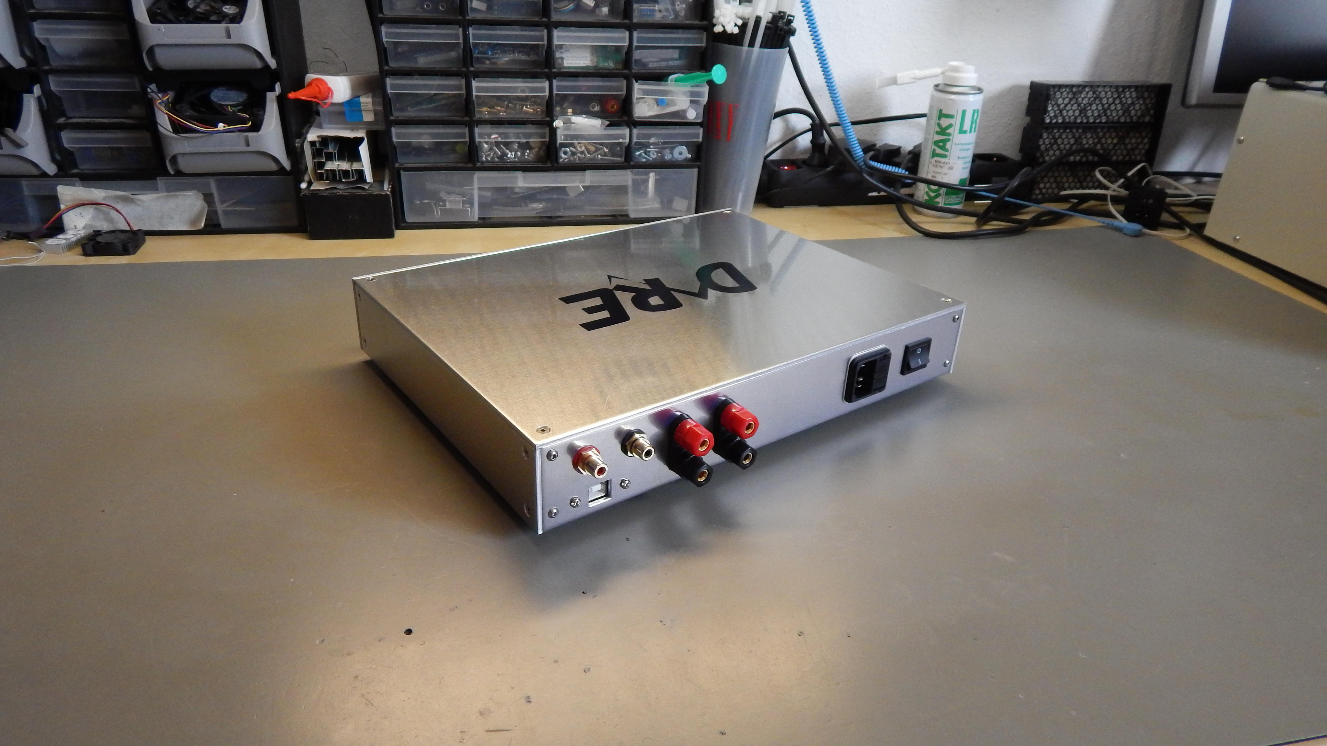 Geworden ist es wieder ein kleiner Class-D auf Basis des TDA8920, angetrieben von 2 50VA Ringkernern und einer großzügigen Siebung. Auf der Eingangsseite haben wir klassisch Cinch und ein experiment mit einem USB-DAC von HifimeDIY: