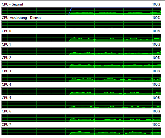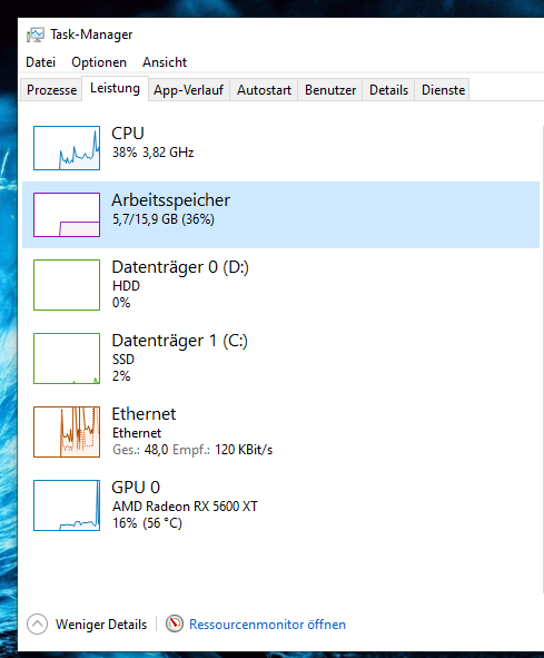 Meine CPU (i7 4790) läuft dabei auf ca. 40% Auslastung, die GPU (radeon rx 5600xt) auf 16%