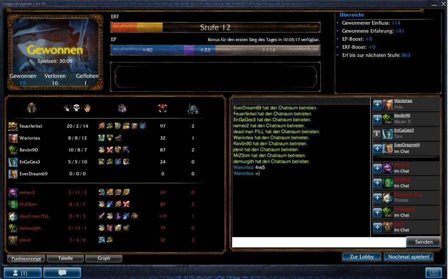 War, obwohl unser Morde von Anfang an wegen extrem hoher Latenzen nicht gespielt hat, ein böses Gemetzel an unseren Gegnern. Ob die Kollegen Poppy, Karthus und Kennen so viel Skill hatten oder das andere Team einfach so schlecht war, kann ich auch nicht sagen - aber sie haben fast immer mit den Gegnern gemacht, was sie wollten (d. h. killen