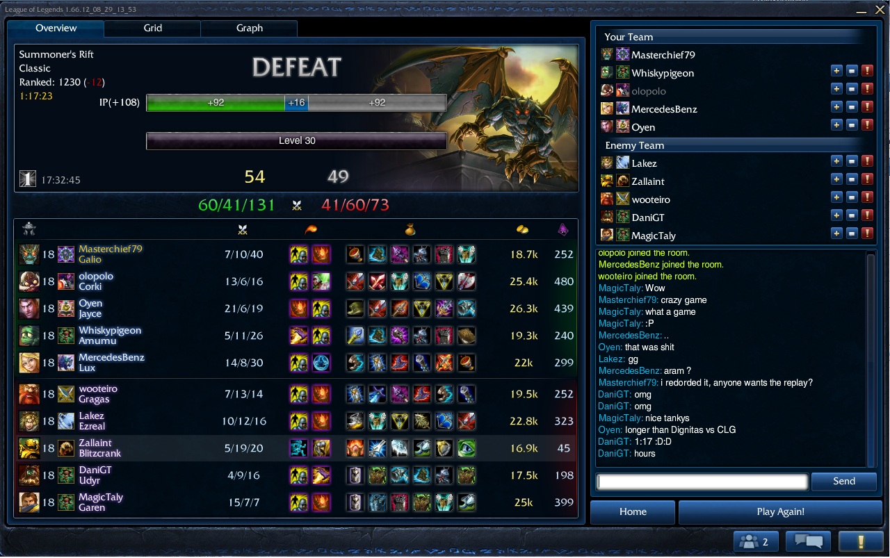 Am Ende waren wir beim Nashor, Amumu war an der Base, Jayce hat gebackdoort und tja - Gragas war leider an unserem Nexus als Jayce bei den Gegnern (da standen auch noch ein paar Tower glaube ich), und wir nicht schnell genug vom Baron wieder da.