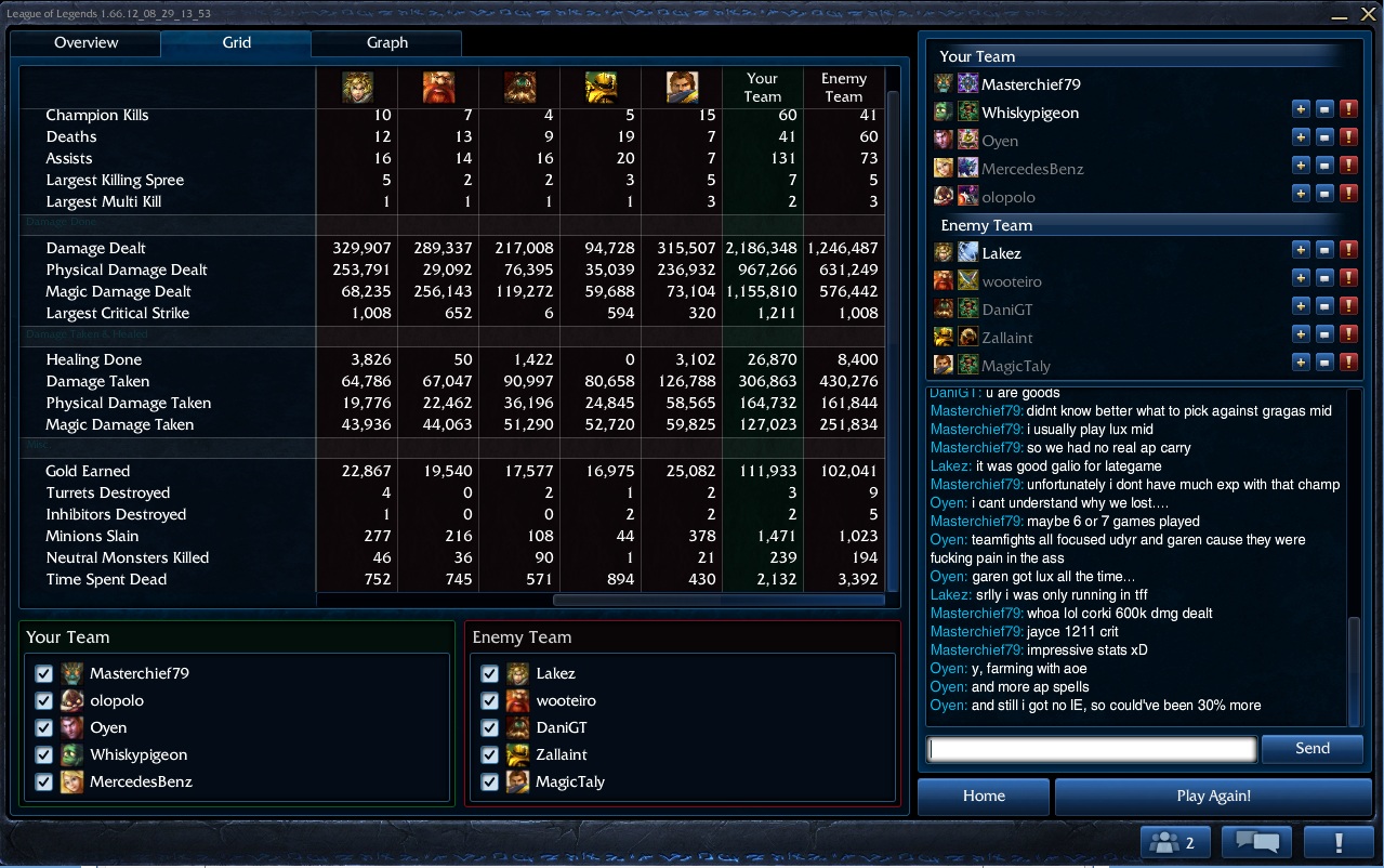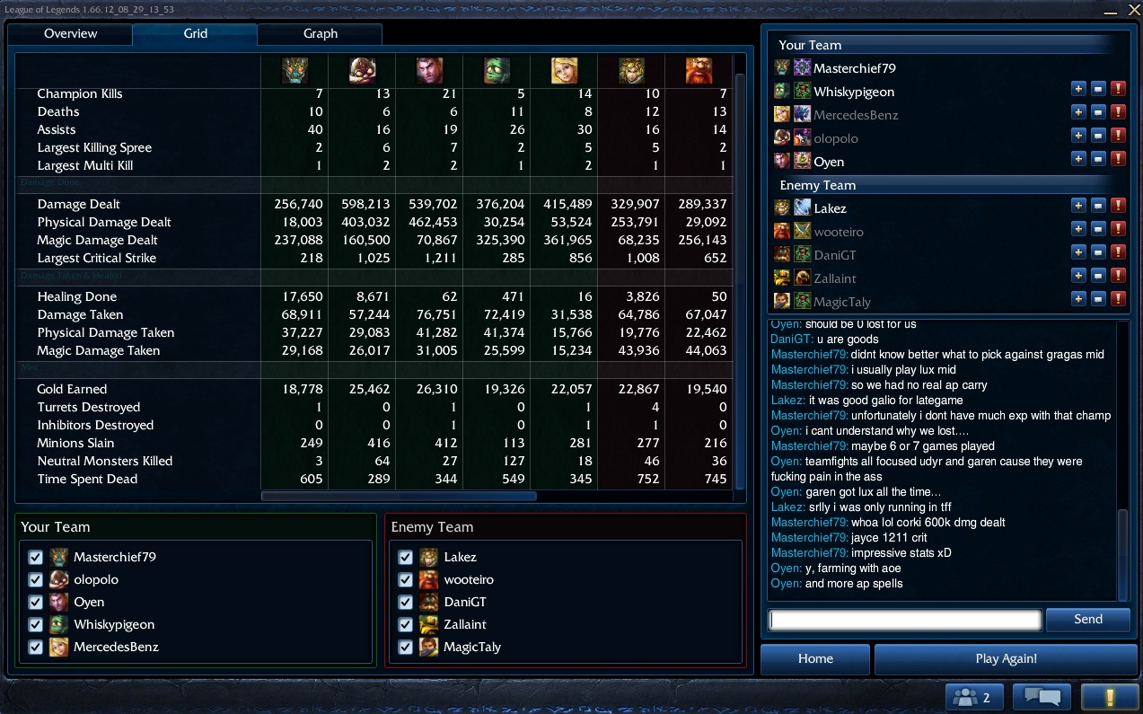 Glaube ich das längste Game was ich je gespielt habe, so ein Hin und Her hab ich noch nicht erlebt. Unser Hauptproblem war eigentlich, dass wir nach den (meist gewonnen) Teamfights vor Lauter deffen nicht zum Pushen/Nashor/Dragon kontrollieren gekommen sind, und Wards sind eh überflüssig wenn 10 Leute Orakel haben.^^ Dementsprechend hockten wir die letzte halbe stunde eigentlich nur in unserer Base drin. xD