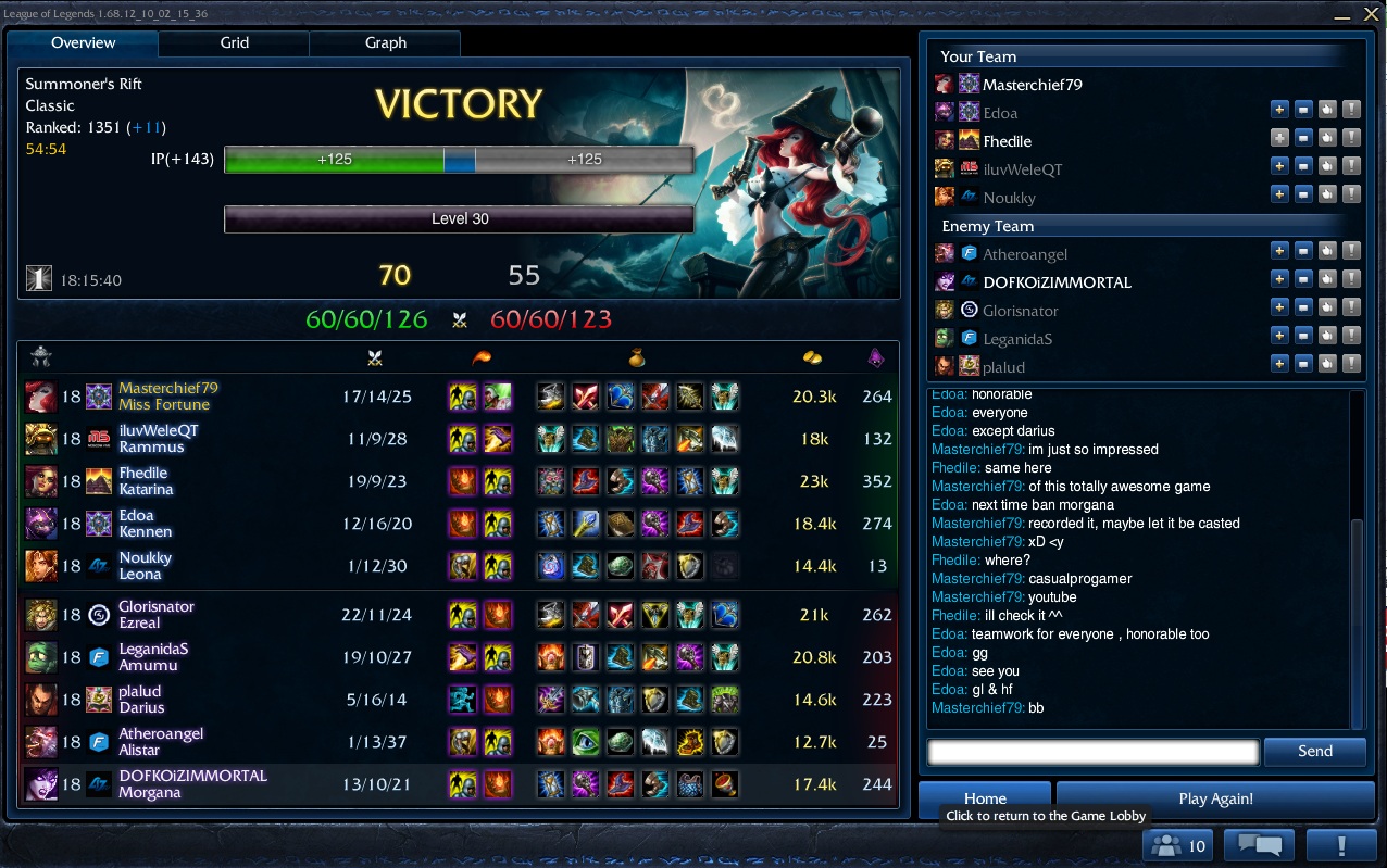 Habs aufgenommen, hatten am Anfang harte Probleme auf Bot (stand zwischenzeitlich 2-8) und hab nur die Assists und keine Kills gekriegt. Durch gute Koordination, gewonnenen Baron Teamfight und gutes Positioning (endlich konnte man mal die Carries zerpflücken) haben wir das dann am Ende noch gedreht, Gott, als der Nexus der Gegner explodiert ist saß ich 10 Sekunden mit offener Kinnlade da.