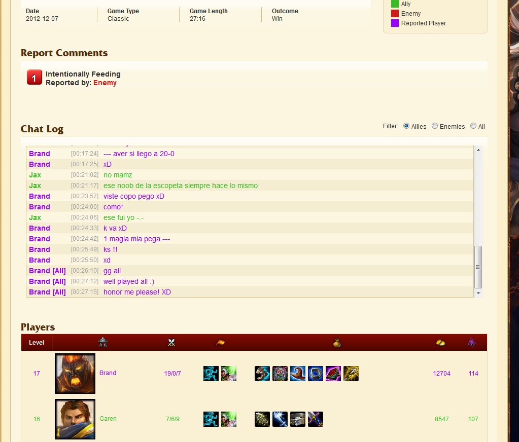 ja, das sehe ich ähnlich, dass auch fragwürdige entscheide gefällt werden. aber wenn wir schon bei fragwürdigen dingen sind, hier ist auch ein kurioser report. ein spieler wurde in einem fall für feeden gemeldet. man beachte, dass der report vom gegner stammt und die stats des gemeldeten. behalte mal ein auge darauf und schaue, wie hier entschieden wurde.