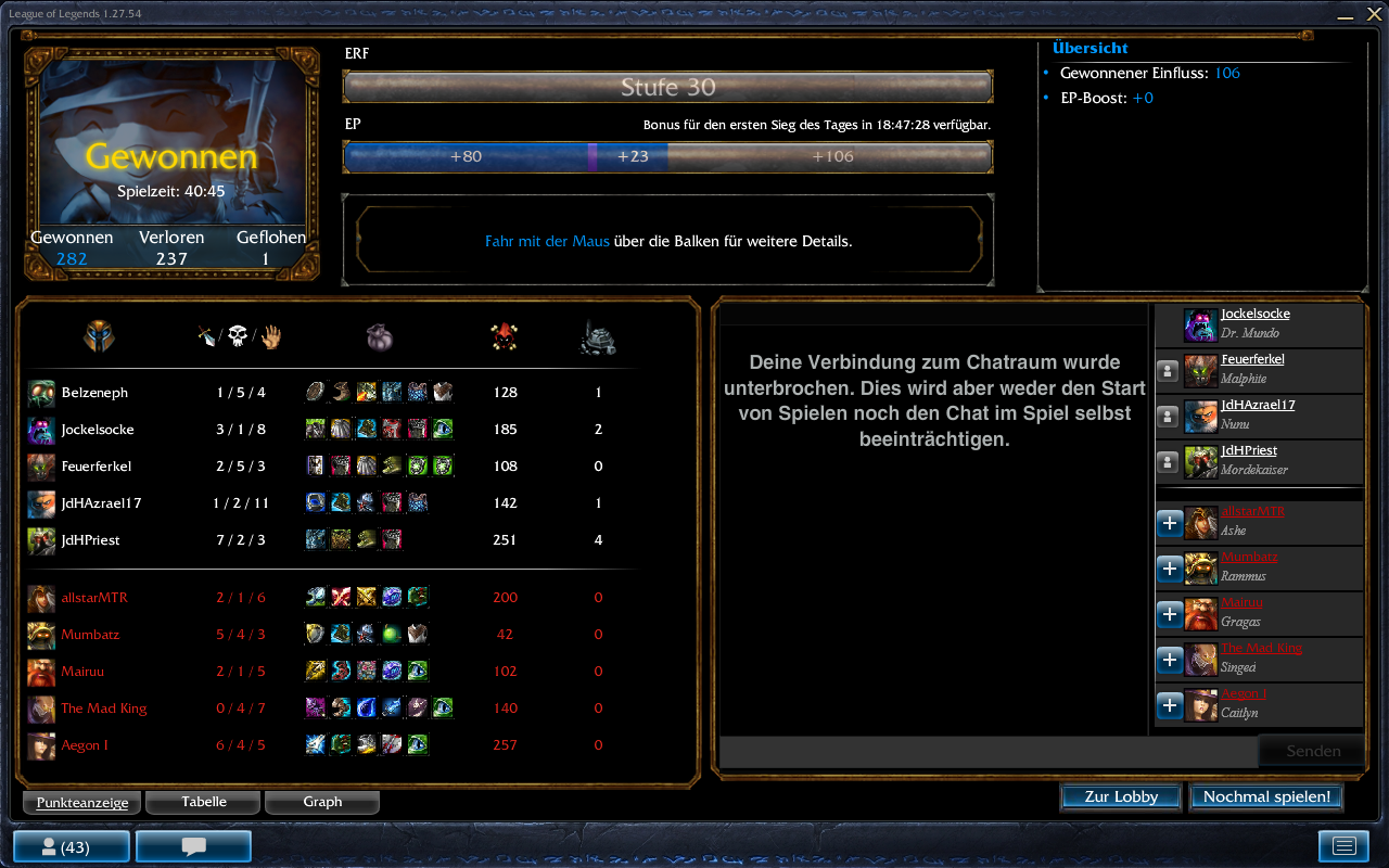 Hinzu kam: Selbst wenn ein paar von uns draufgegangen sind, konnten sie nicht pushen, weil wir Befestigung hatten. Ich glaube, wir haben nicht einen Turm verloren, oder? Und man darf ja auch nicht unterschätzen, was wir für Schaden gemacht haben. Morde, Mundo und Nunu können ja auch austeilen und die zwei DDs im Gegnerteam waren ganz schnell down.